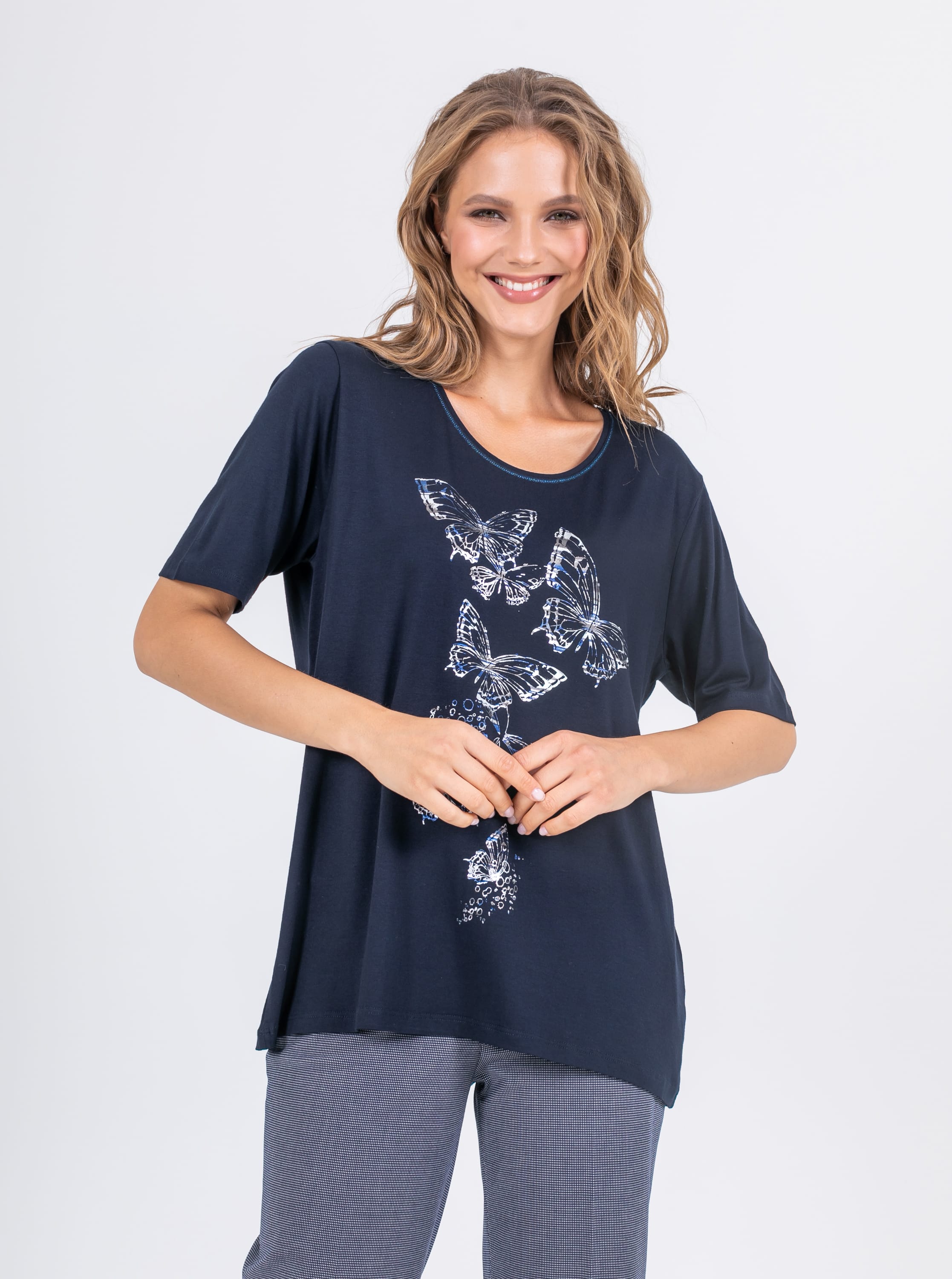 На сайте указаны российские размеры. Длинная футболка прямого силуэта из легкой, мягкой вискозы с добавлением эластана. По переду выполнен яркий принт в виде белых бабочек. Укороченные втачные рукава. Круглый вырез горловины с отделочной строчкой по переду.