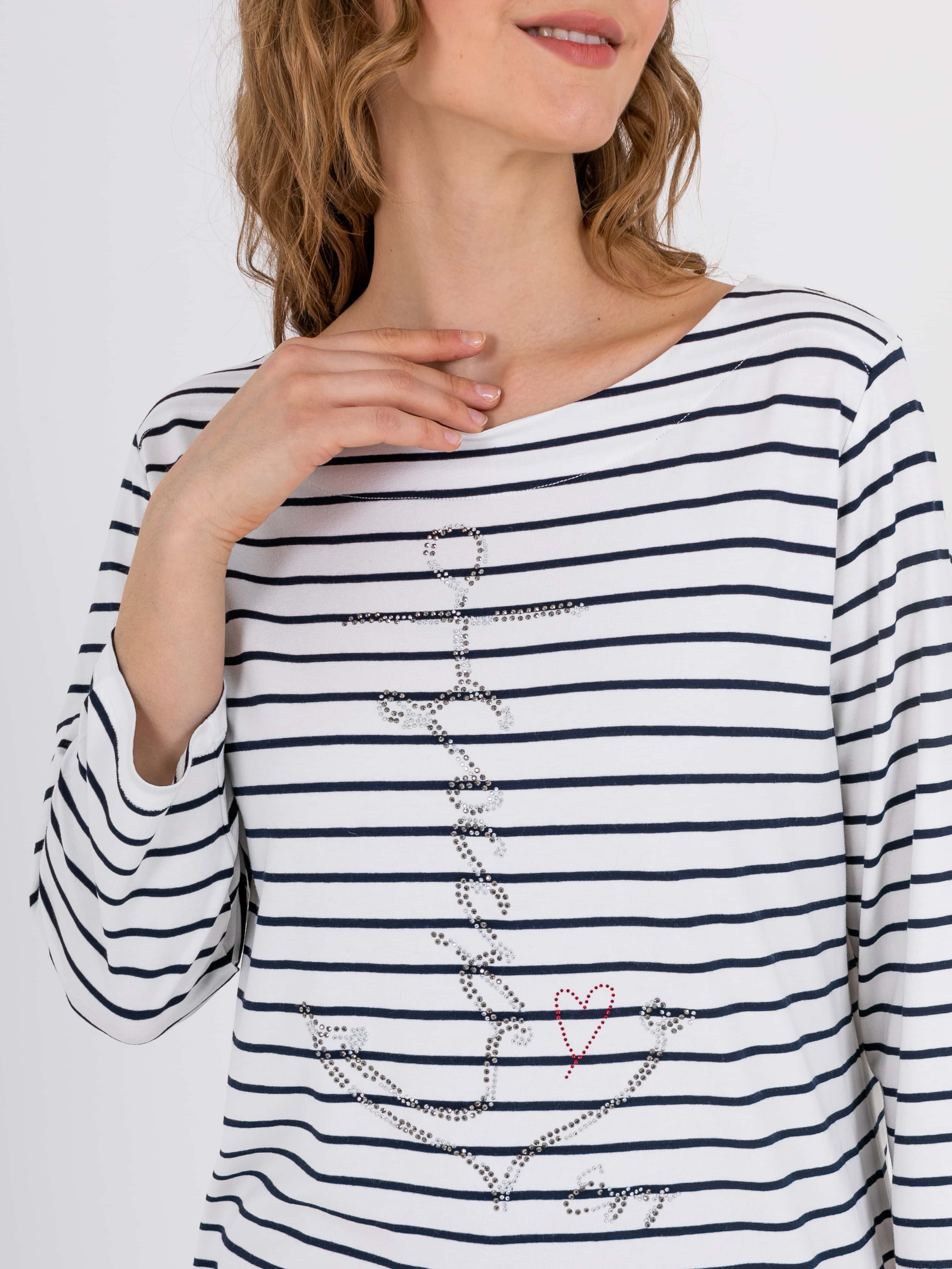 На сайте указаны российские размеры. Ткань: изготовлена из высококачественной вискозы (92%) – экологичного материала, хорошо пропускающего воздух и впитывающего излишки влаги, и эластана (8%), придающего ткани упругость. Крой: футболка удлиненная прямого силуэта, закрывающая область паха, может выступать как туника. Универсальности модели добавляет рукав-реглан ¾, который подарит уютное тепло в холода и защитит руки от ярких солнечных лучей на отдыхе. Футболка имеет неглубокий круглый вырез, подчеркивающий красоту шеи. Отделка: классическую футболку-тельняшку украшает рисунок, выложенный из умеренно сияющих страз. Стразы надежно закреплены, выдерживают множество стирок.