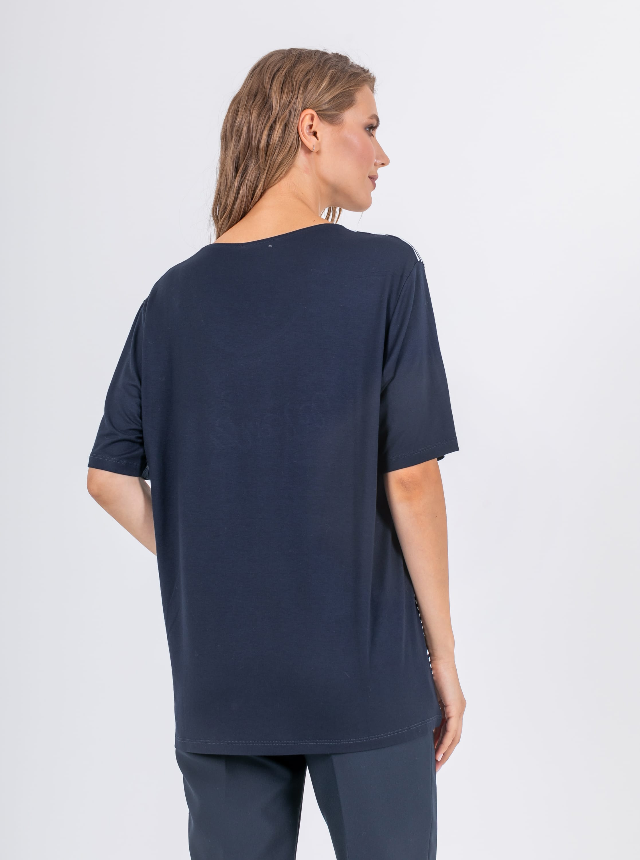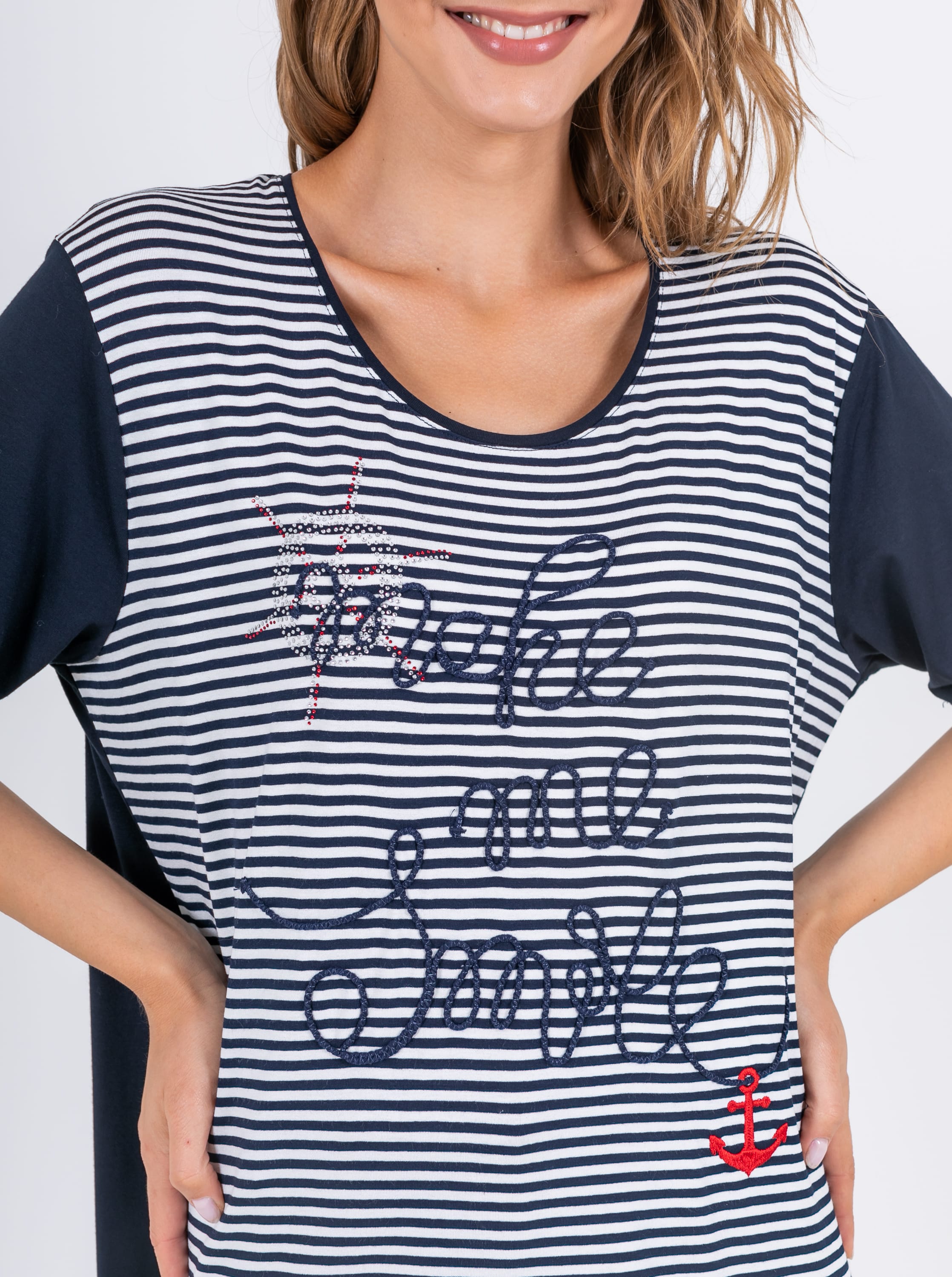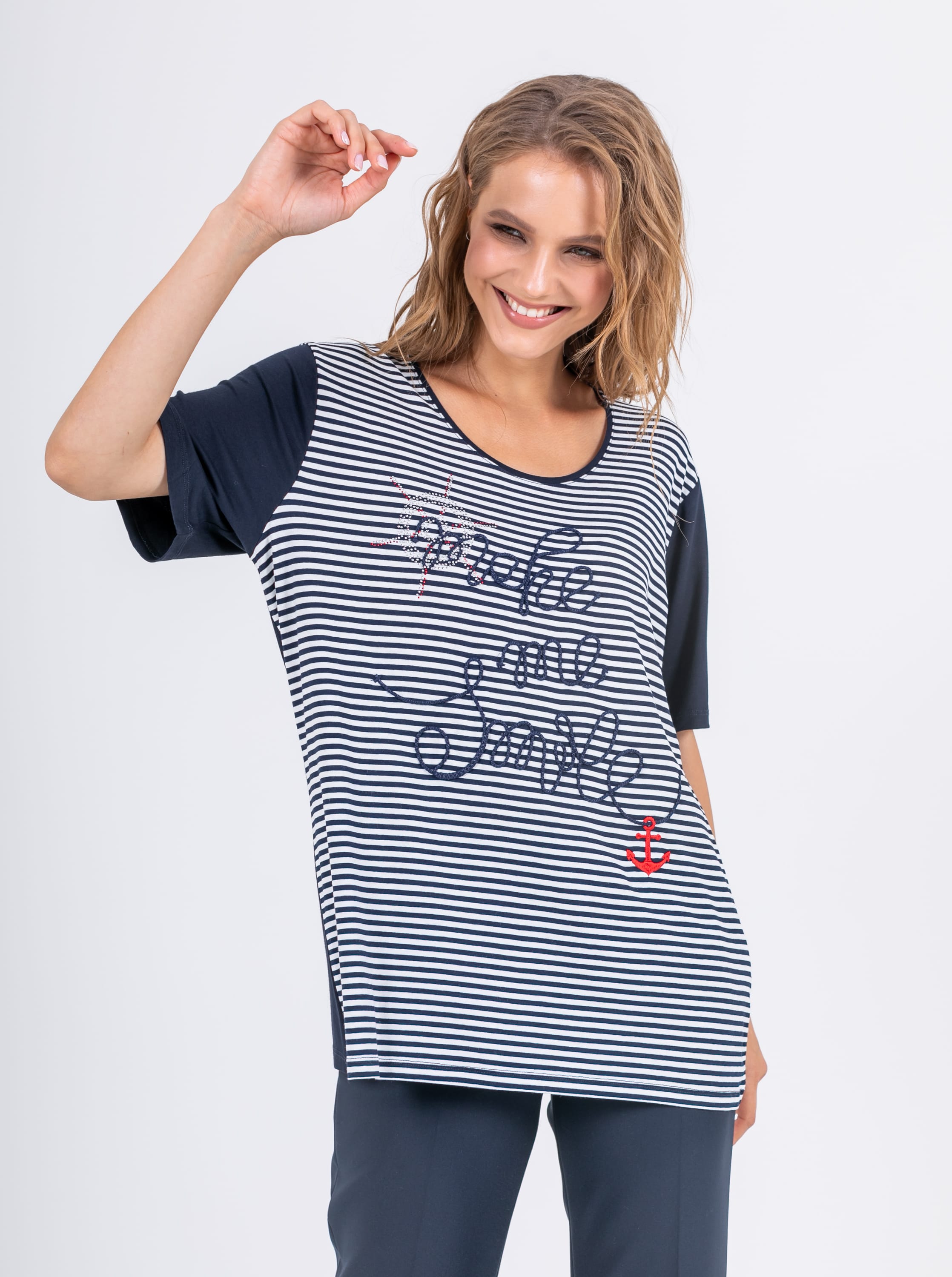 На сайте указаны российские размеры. Ткань: изготовлена из высококачественной вискозы (92%) – экологичного материала, хорошо пропускающего воздух и впитывающего излишки влаги, и эластана (8%), придающего ткани упругость. Крой: удлиненная футболка прямого силуэта с круглой горловиной и свободным рукавом-регланом. Дарит комфорт и свободу движения, без скованности. Полностью не прилегает к телу, а значит, не подчеркивает возможные нюансы фигуры, о которых не нужно знать всем. Отделка: спинка и рукава – однотонные, передняя часть футболки – из полосатой ткани, на которой вышит текст и яркий красный якорь, напоминающие об отдыхе на море. Футболка также украшена элементом из страз, которым не страшны многочисленные циклы стирок.