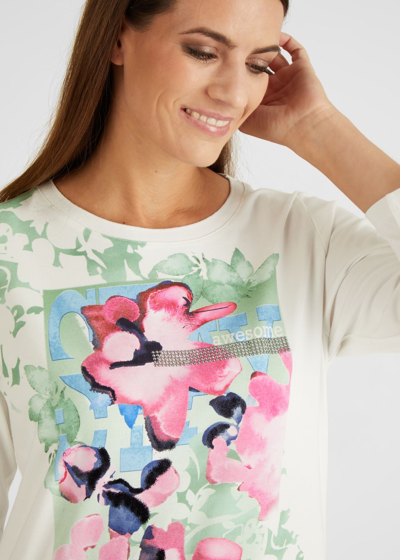 На сайте указаны российские размеры. Однотонная рубашка с рукавами 3/4 и очаровательным принтом спереди и аппликацией из страз привлекает внимание. Качество мягкого трикотажа и хлопка гарантирует удобную посадку. Сочетайте эту рубашку с джинсами или небрежно с спортивными брюками. Рост модели 176 см. Длина по спинке от плеча для размера 46: 64 см.