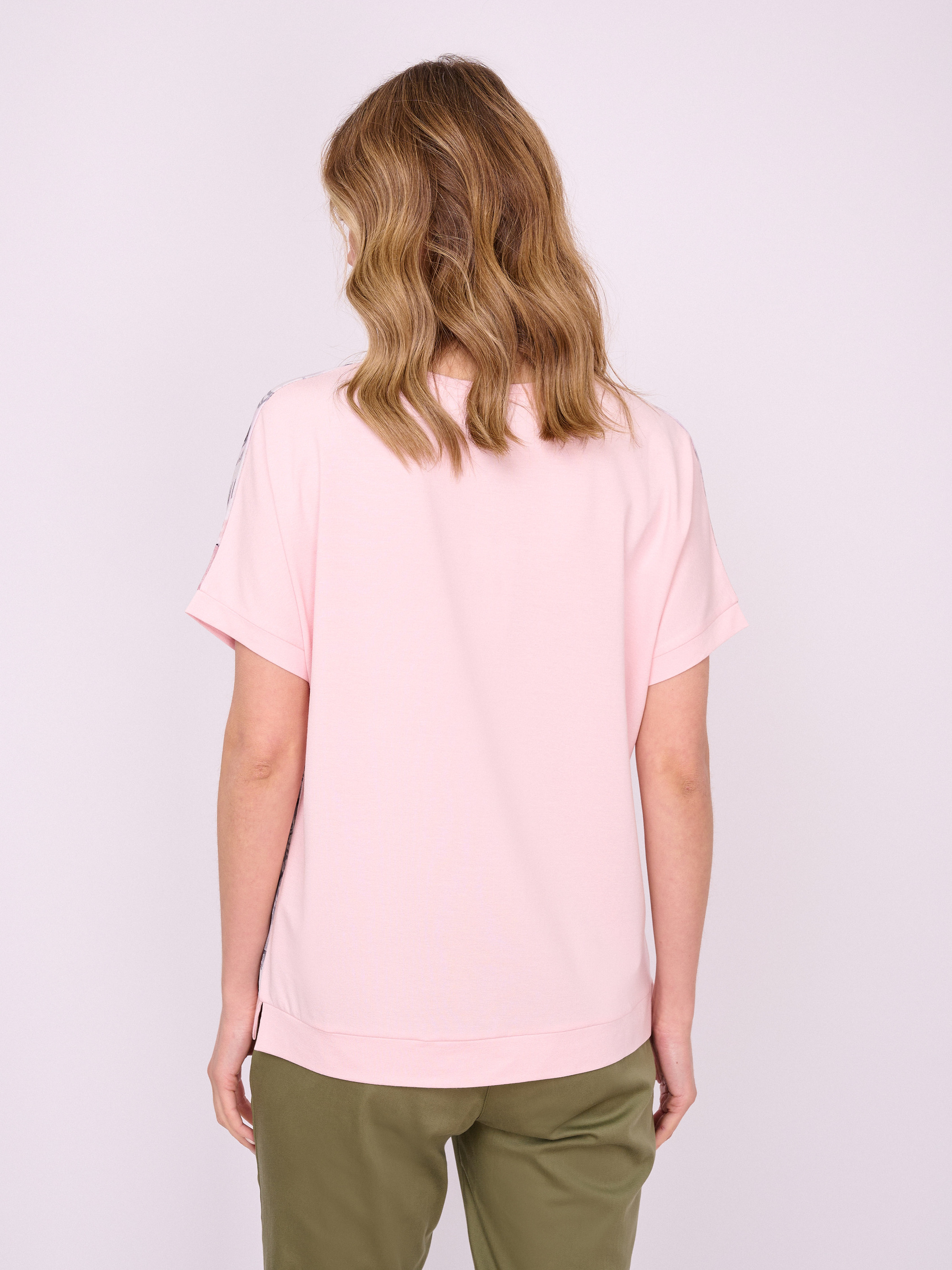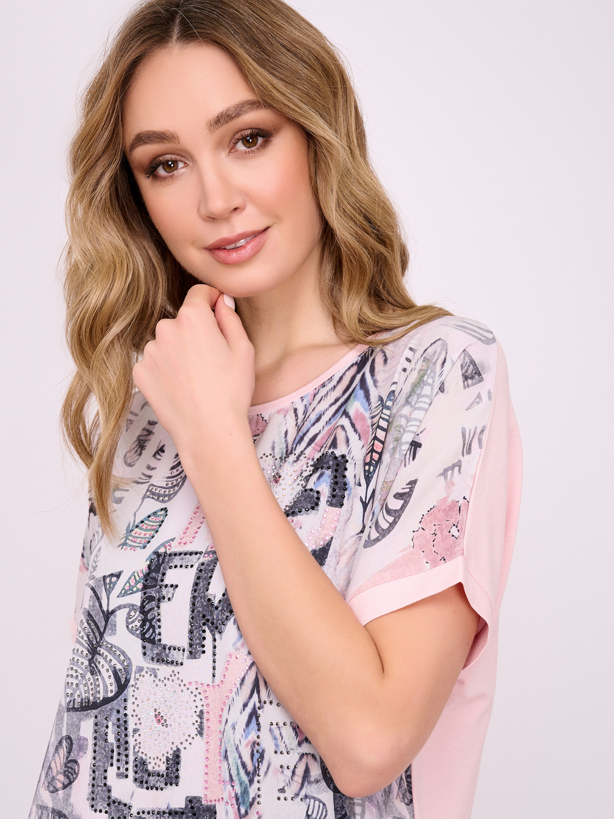 На сайте указаны российские размеры. Трикотажная прямая бледно-розовая футболка с круглым вырезом, с коротким рукавом, с цветочным рисунком и стразами. Длина по спинке: 60 см. Рост модели: 175 см.