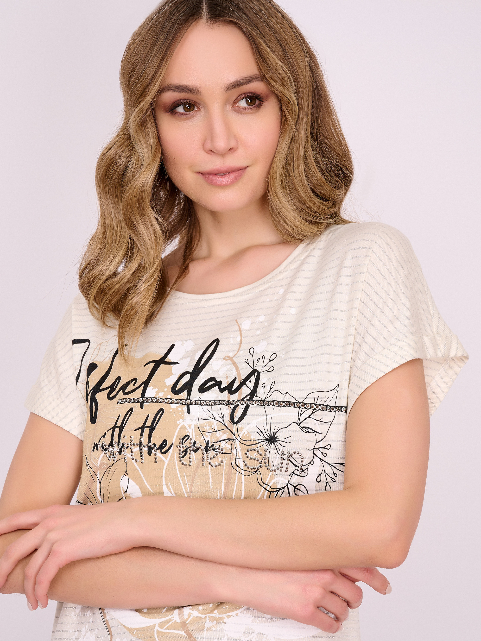 На сайте указаны российские размеры. Джемпер с короткими цельнокроеными рукавами и надписью на груди. Длина по спинке: 59 см. Рост модели 175 см.
