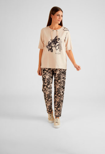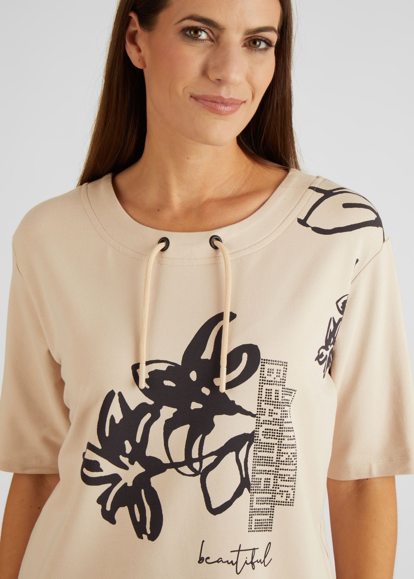 На сайте указаны российские размеры. Толстовка с незаметным воротником-стойкой украшена интересным принтом спереди и аппликацией из страз. Сочетание цветочного рисунка и надписей делает эту рубашку уникальной. Кулиска на воротнике придает этой толстовке непринужденный вид. Носите рубашку небрежно или элегантно с джинсами и модными кроссовками. Длина по спинке от плеча для размера 46: 68 см. Рост модели 176 см.