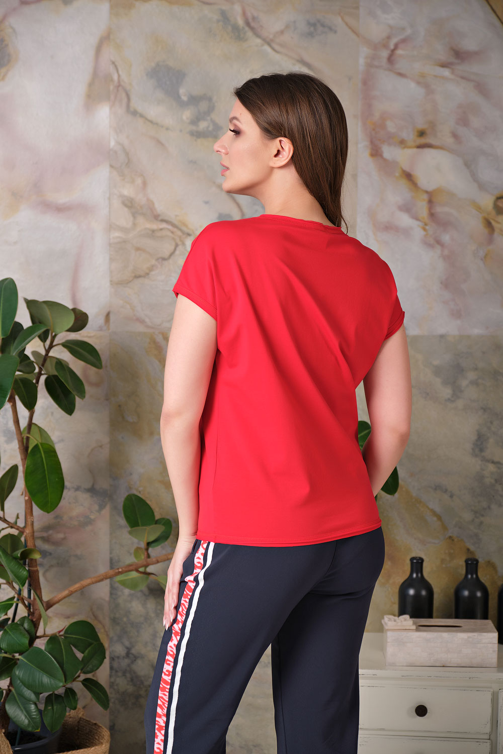 Ткань из натуральных материалов обеспечит комфорт и прохладу жарким летом. Круглый вырез горловины создает женственный образ. Короткие цельнокроенные рукава делают модель более женственной. Полуприлегающий покрой подчеркивает изящный силуэт. Футболка украшена вышивкой и пайетками. Данная модель будет хорошо сочетаться с брюками.