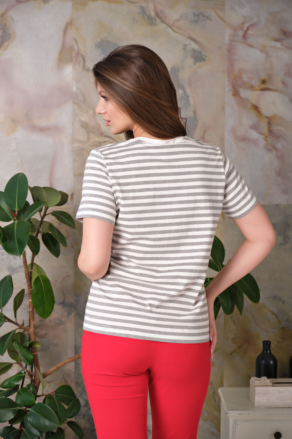 Ткань из натуральных материалов обеспечит комфорт и прохладу жарким летом. Свободный покрой скроет недостатки фигуры. Поверх принта "полоска" располагается вышивка "сердце". Простой и лаконичный дизайн делает данную модель базовой, позволяя удачно сочетать ее с разными комплектами одежды.
