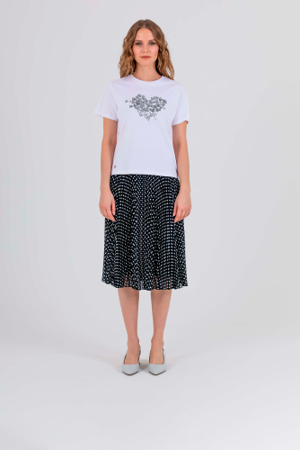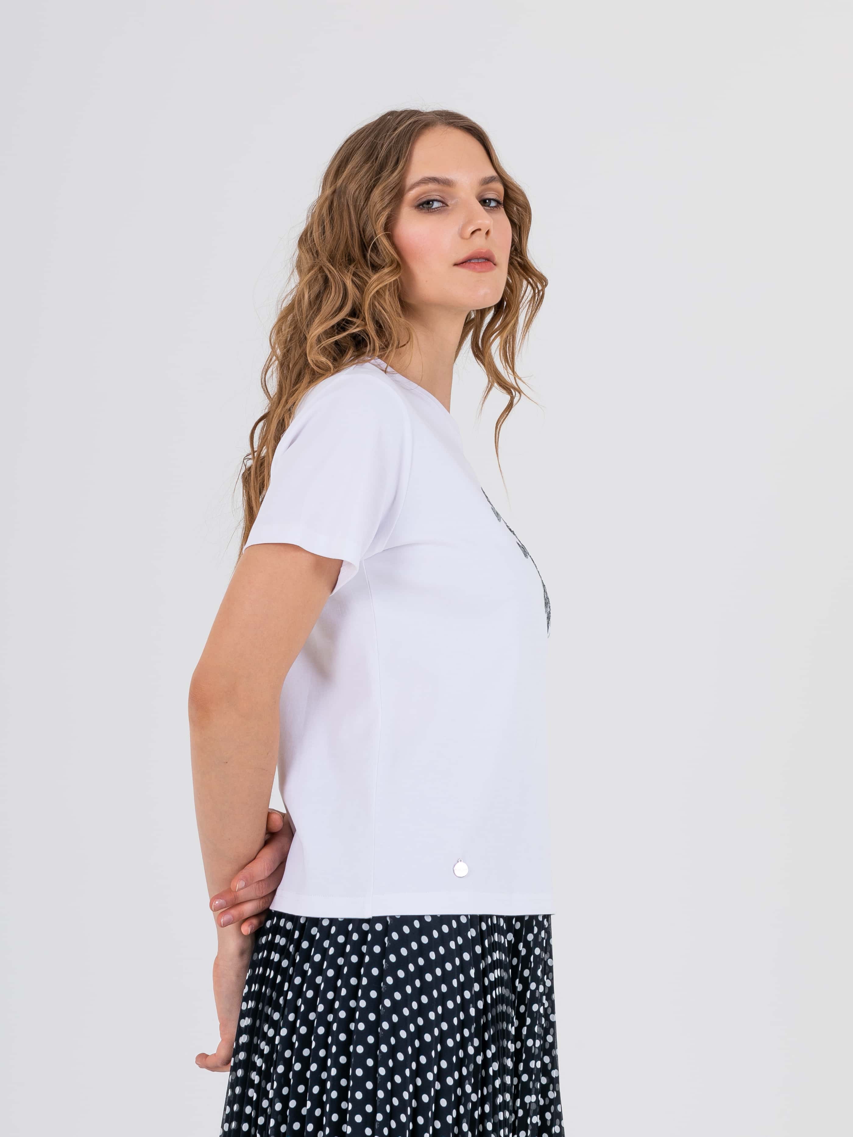 Футболка средней длины прямого силуэта из легкого хлопка. По переду выполнена нежная вышивка пайетками. Укороченные втачные рукава. Круглый вырез горловины.
