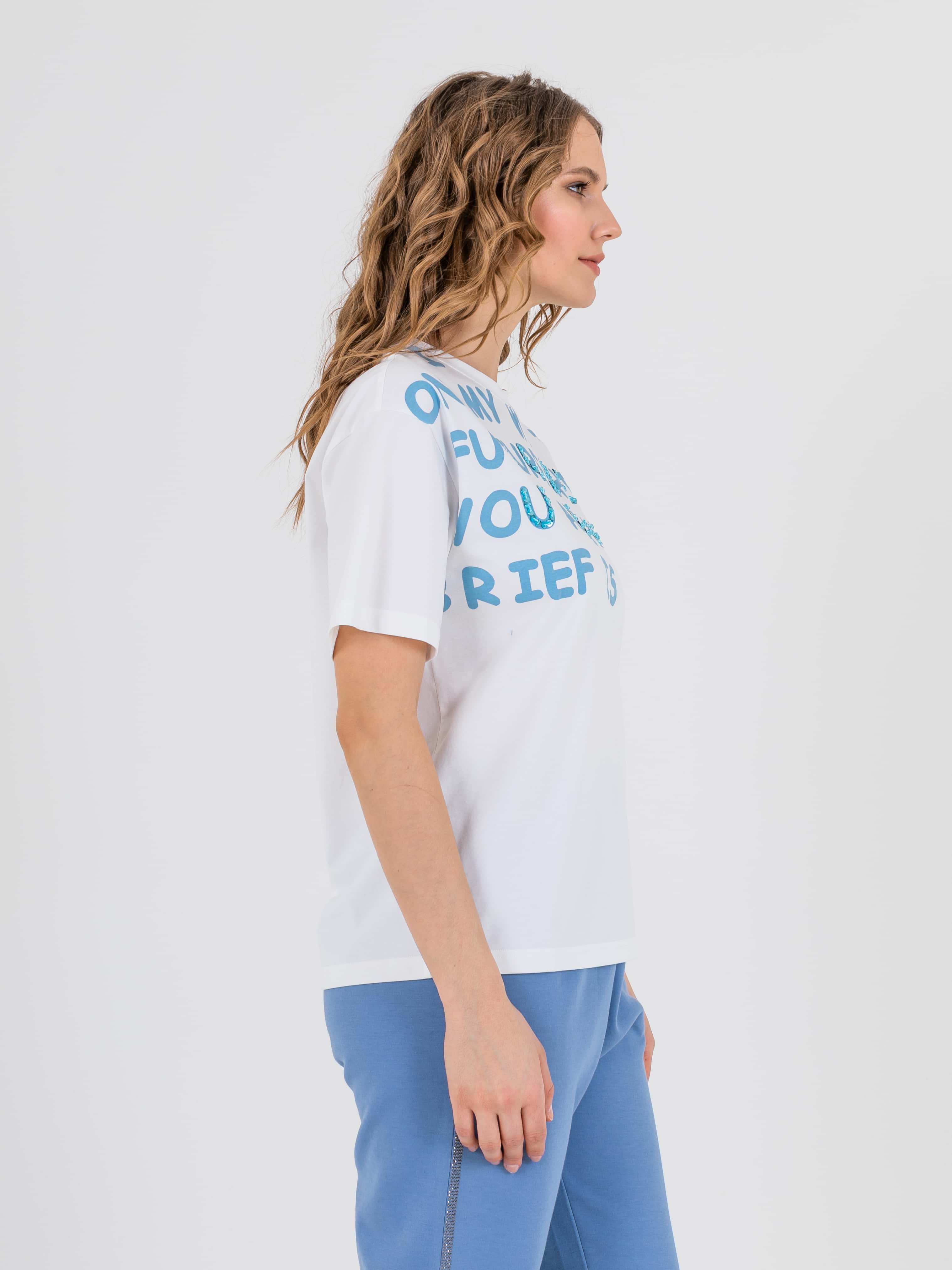 Футболка средней длины прямого силуэта из легкого хлопка с добавлением кукурузы. По переду выполнен яркий принт с вышивкой пайетками. Укороченные втачные рукава со спущенной линией плеча. Круглый вырез горловины.
