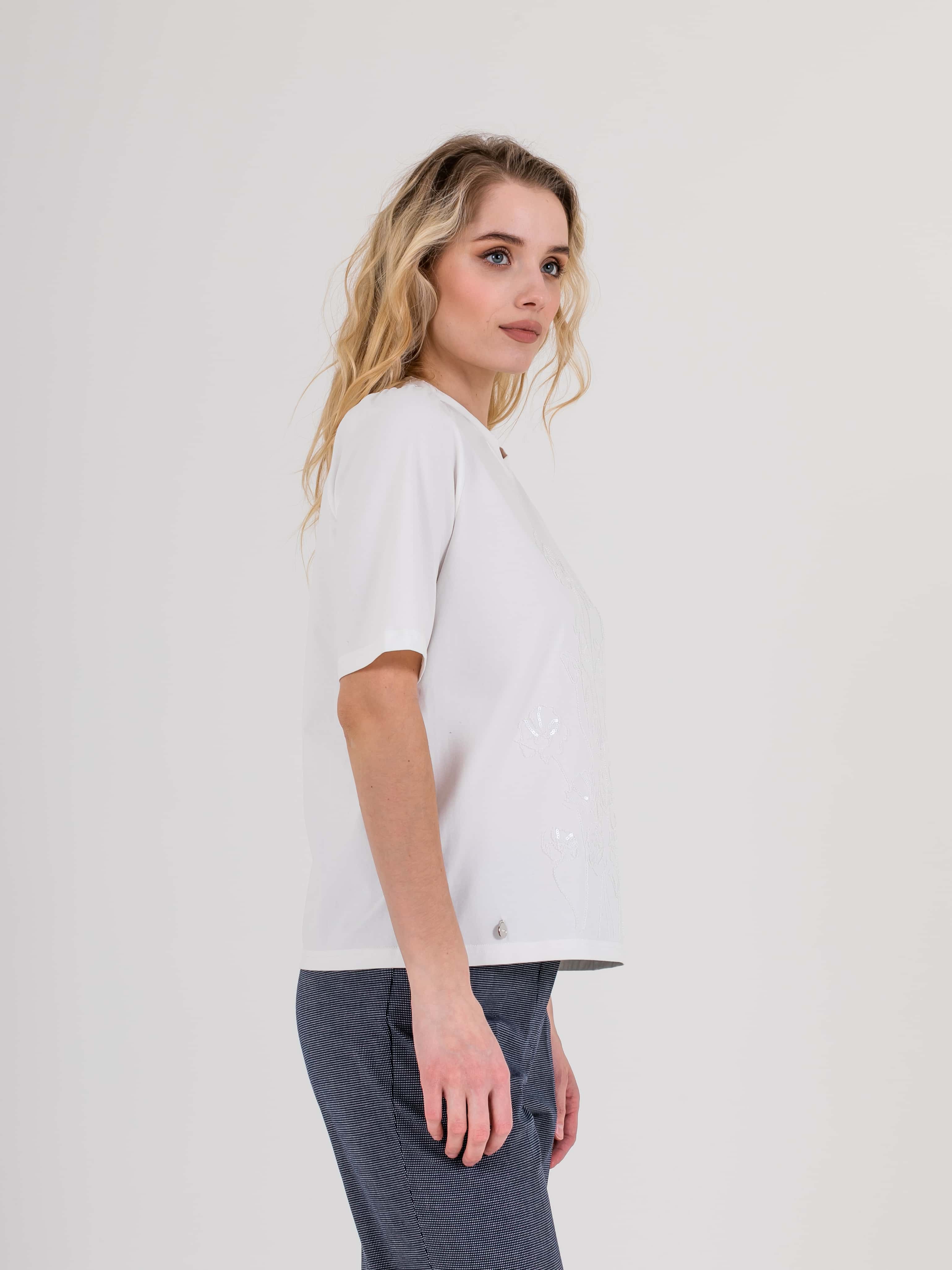 Укороченная футболка прямого силуэта из легкого хлопка с добавлением спандекса. По переду выполнена нежная вышивка. Укороченные втачные рукава с небольшой сборкой по пройме. Круглый вырез горловины.