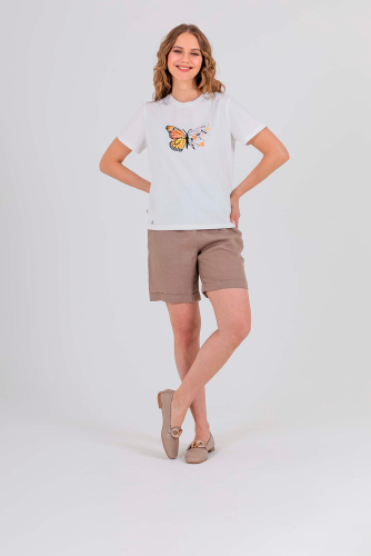 Укороченная футболка прямого силуэта из легкого хлопка с добавлением спандекса. По переду выполнен яркий принт с вышивкой пайетками и стразами. Укороченные втачные рукава. Круглый вырез горловины.