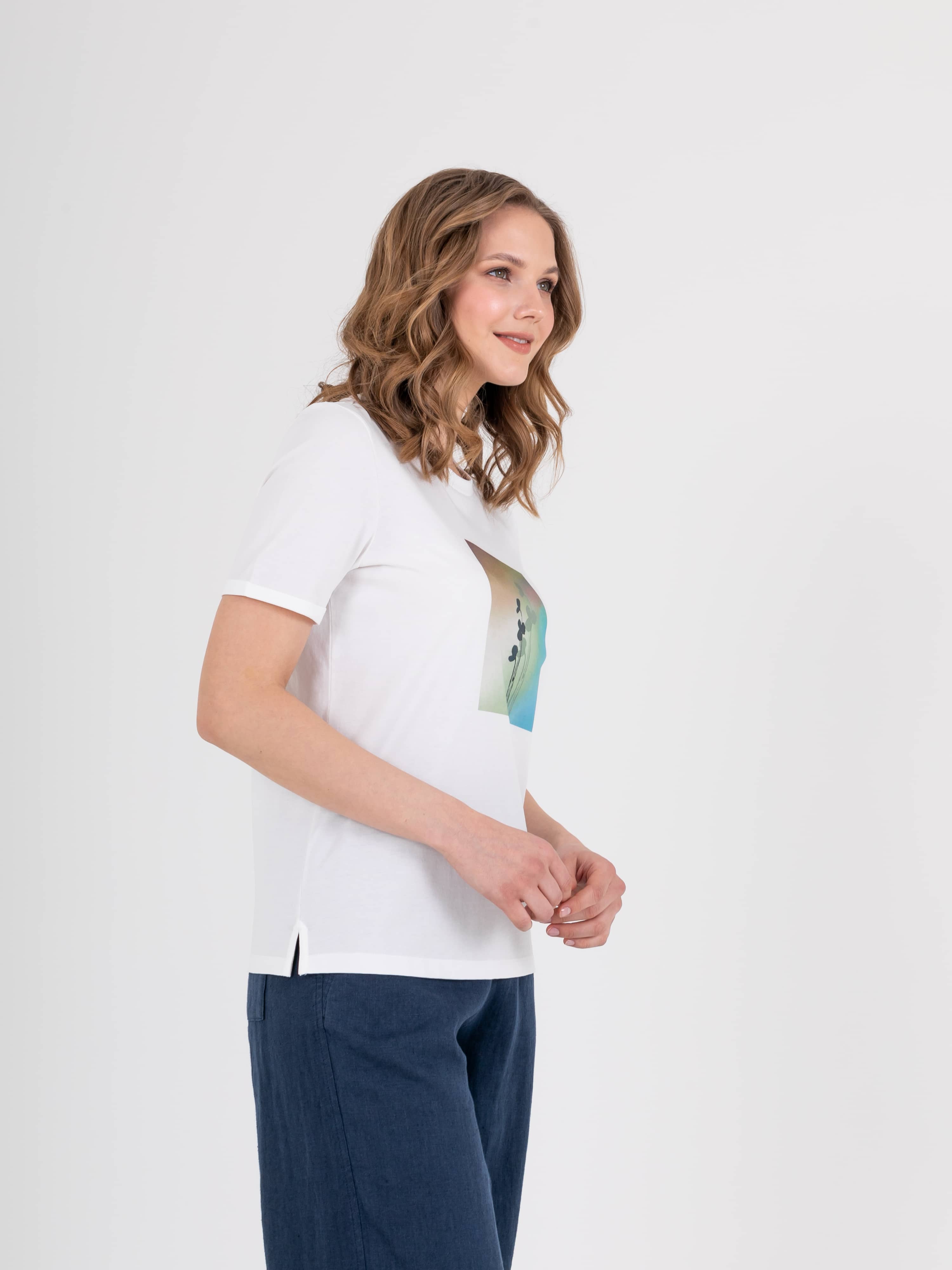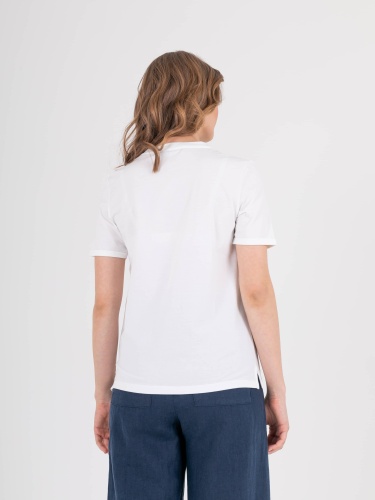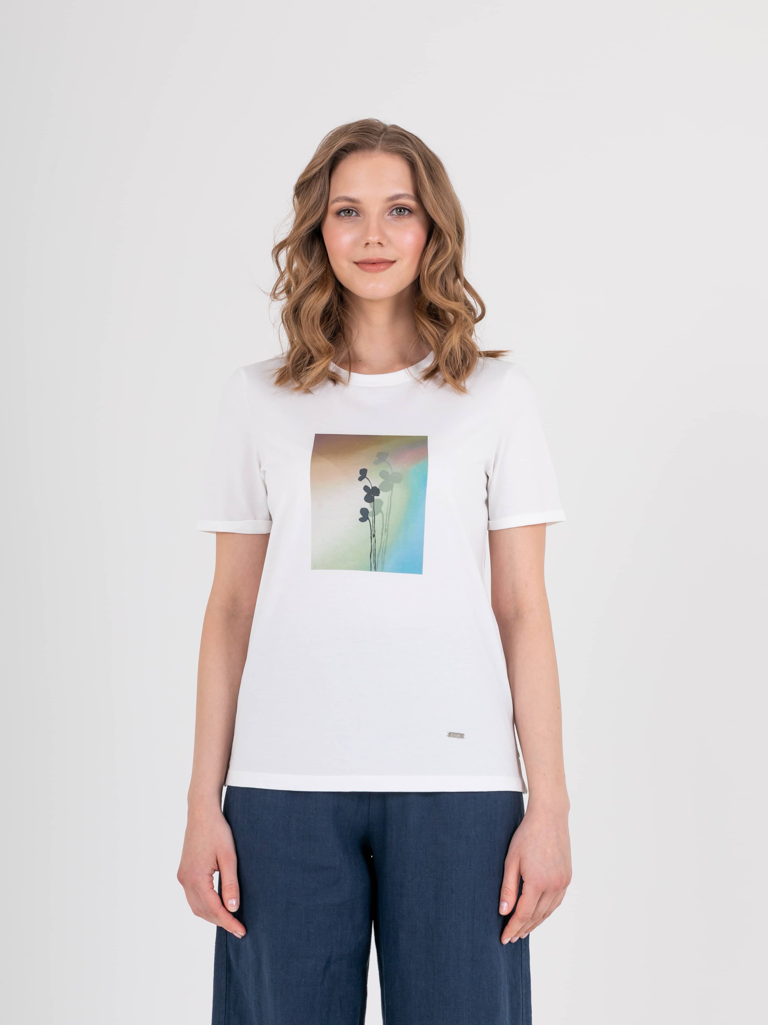 Футболка средней длины прямого силуэта из легкого 100% хлопка с разрезами в боковых швах. По переду выполнен нежный растительный принт. Укороченные втачные рукава. Круглый вырез горловины.