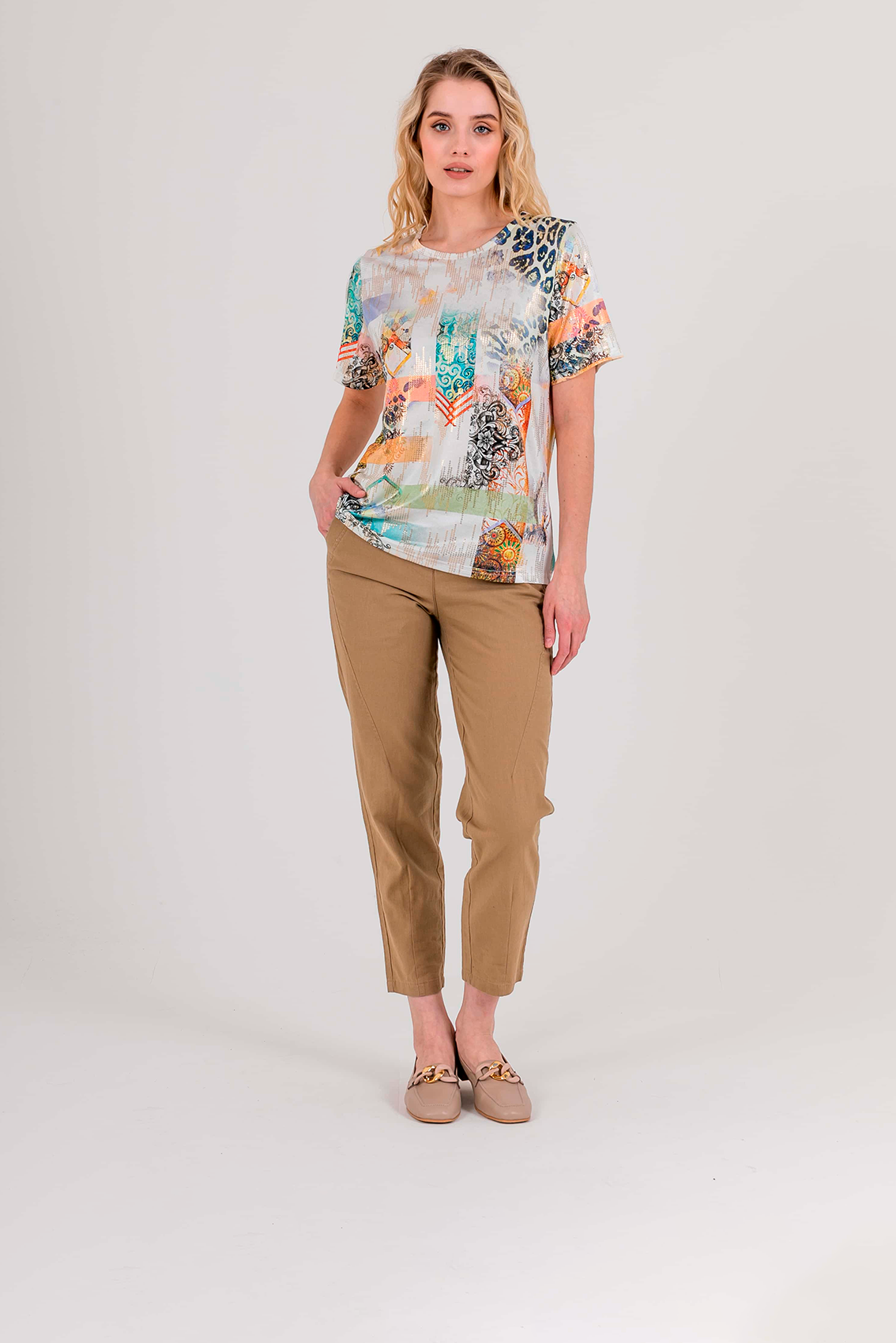 Футболка средней длины прямого силуэта из полиэстера с добавлением эластана, дизайнерская особенность модели – эффектный принт в восточном стиле с имитацией пайеток. Укороченные втачные рукава. Круглый вырез горловины.