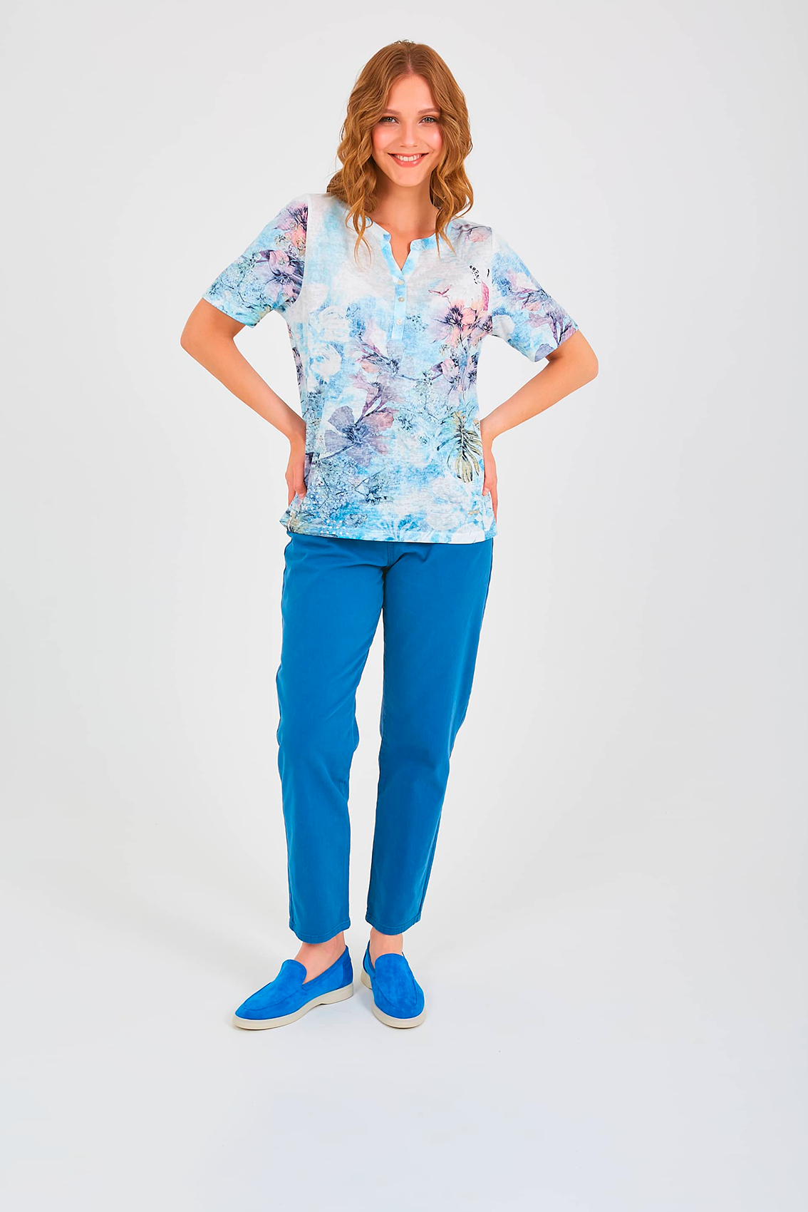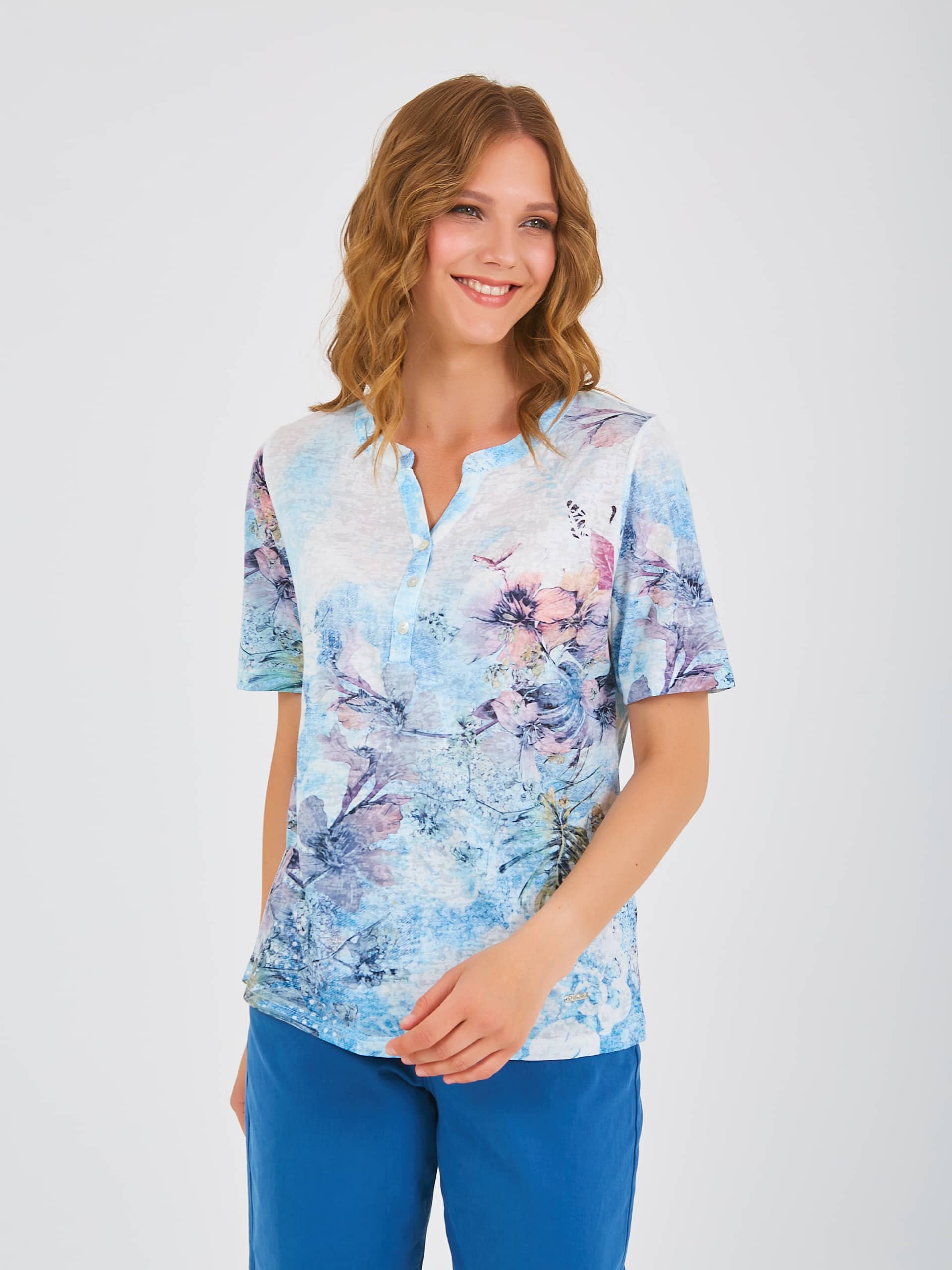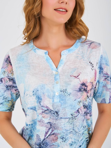 Футболка средней длины прямого силуэта из полиэстера с добавлением мягкой вискозы, дизайнерская особенность модели – тропический принт и фактурный трикотаж. Укороченные втачные рукава. Круглый вырез горловины с разрезом и планкой на три прорезные петли и пуговицы.