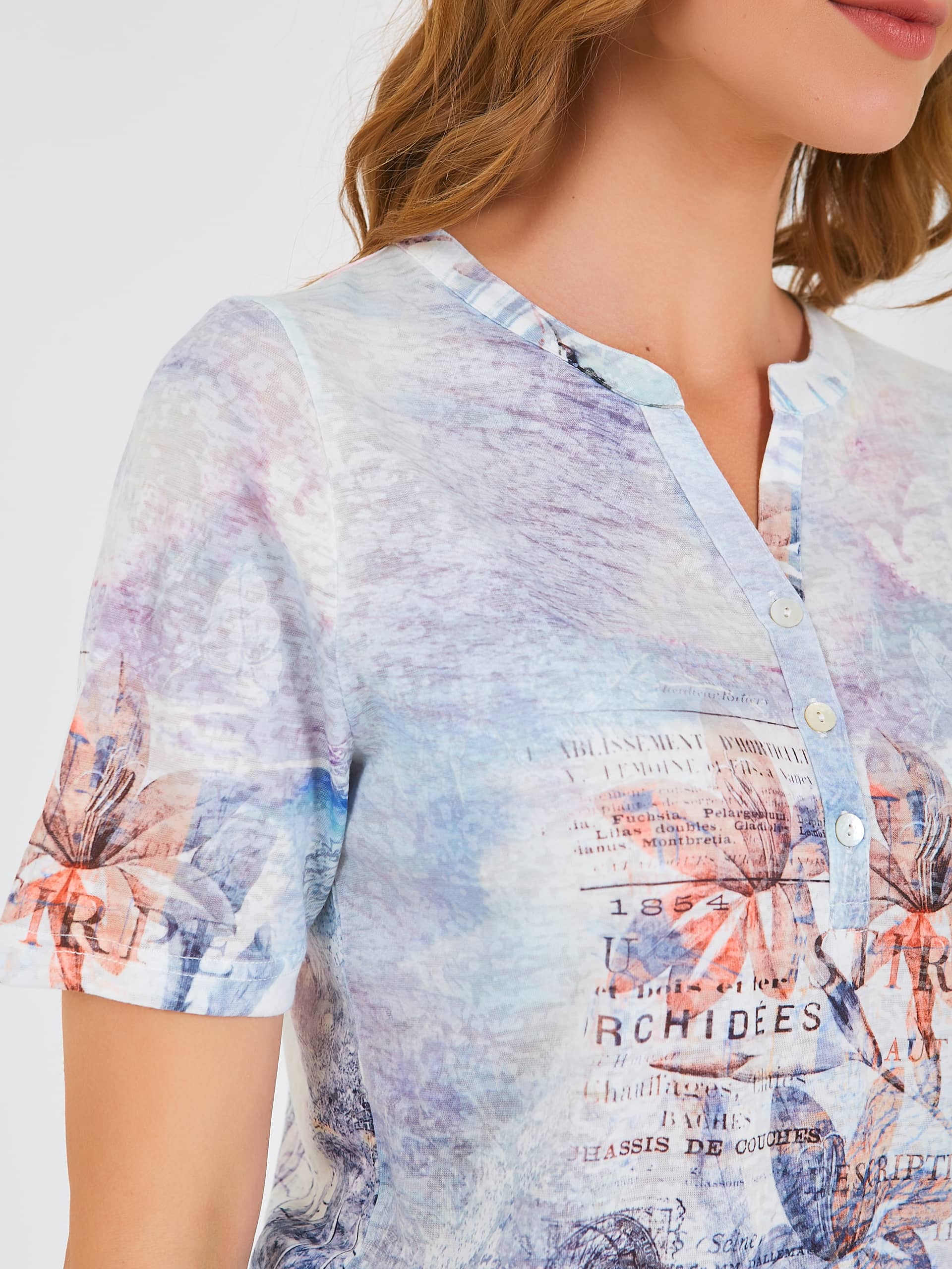 Футболка средней длины прямого силуэта из полиэстера с добавлением мягкой вискозы, дизайнерская особенность модели – нежный принт и фактурный трикотаж. Укороченные втачные рукава. Круглый вырез горловины с разрезом и планкой на три прорезные петли и пуговицы.