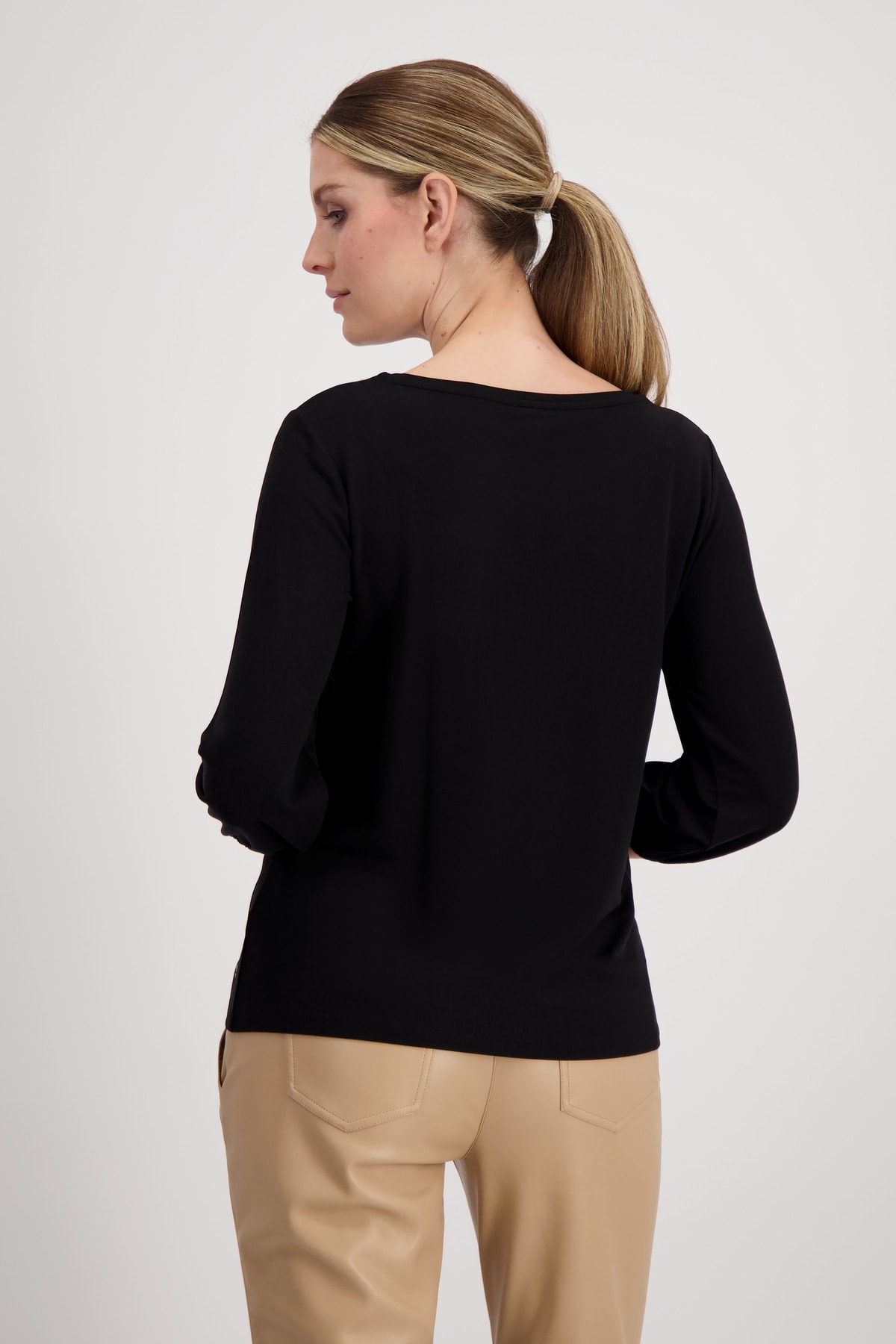 Мягкая на ощупь и оптимальная посадка, рубашка с рукавом 3/4 удобна в ношении. Она декорирована леопардовым узором в тон с надписью блестками. Круглый вырез горловины со швом из блестящего люрекса. Подол рукава на резинке. Длина 44 размера 62 см.
