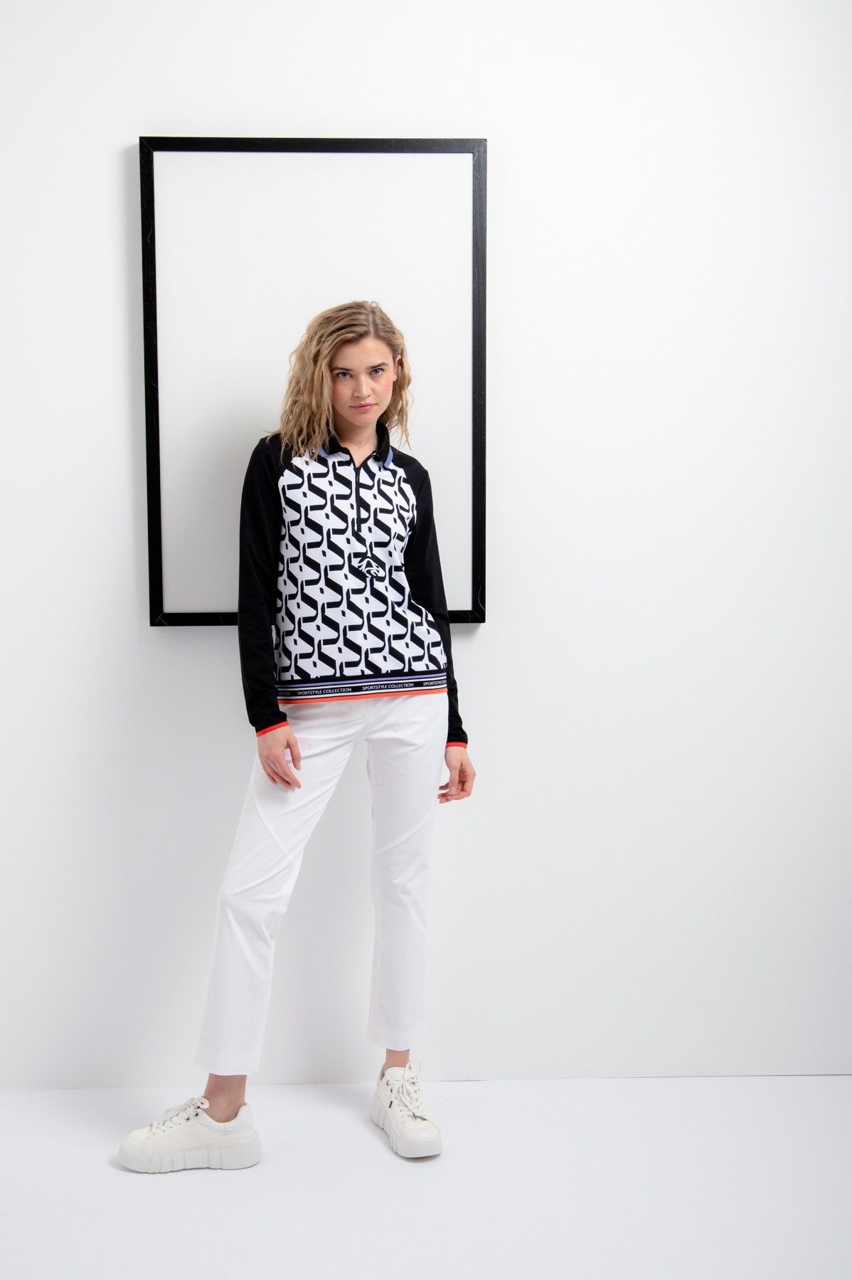 Повседневная рубашку-поло с длинными рукавами. Классический вязаный воротник имеет контрастную полоску по краю и заканчивается короткой молнией, гарантирующей комфортное одевание. Передняя часть с эксклюзивным графическим принтом со встроенными логотипами Sportalm привлекает всеобщее внимание. Рукава отделаны эластичной резинкой, а по низу имеется полосатая вышивка на манжете с надписью Sportalm. Классическую этикетку сзади заменяет принт из фольги.