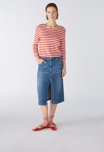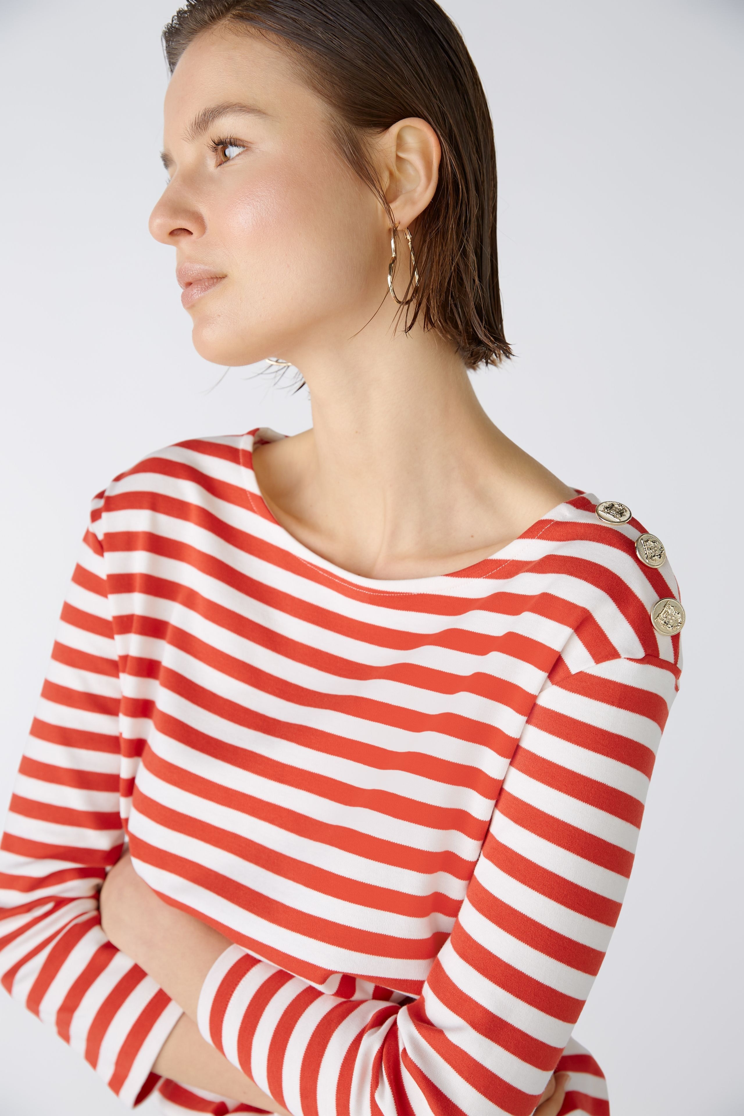 Мягкая, подчеркивающая фигуру футболка из 100% хлопка с декортиавными пуговицами на плече. Чистый, мягкий хлопок, связанный в полоску, без принтов. Прямой крой, стандартная длина. Женственный вырез «лодочка». Рукава длиной 3/4, на одном плече декоративные металлические пуговицы золотистого цвета. Небольшие разрезы по подол. Длина для размера 42: 64 см.