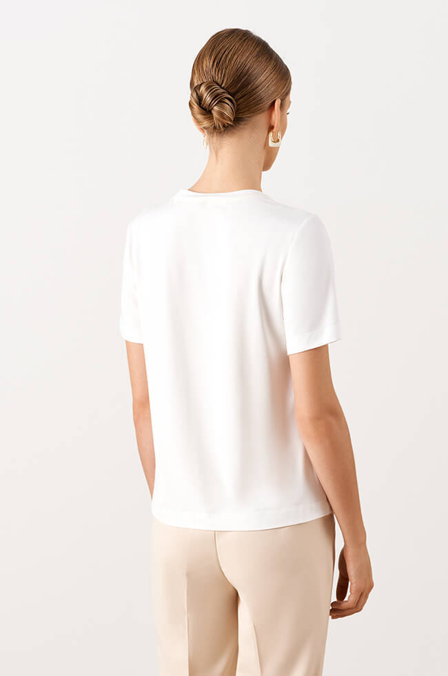 Классическая футболка прямого силуэта, выполнена из приятного вискозного полотна. Округлый вырез горловины. Короткие рукава. Спереди выполнен дизайнерский принт «Полевые цветы», декорированный стразами.