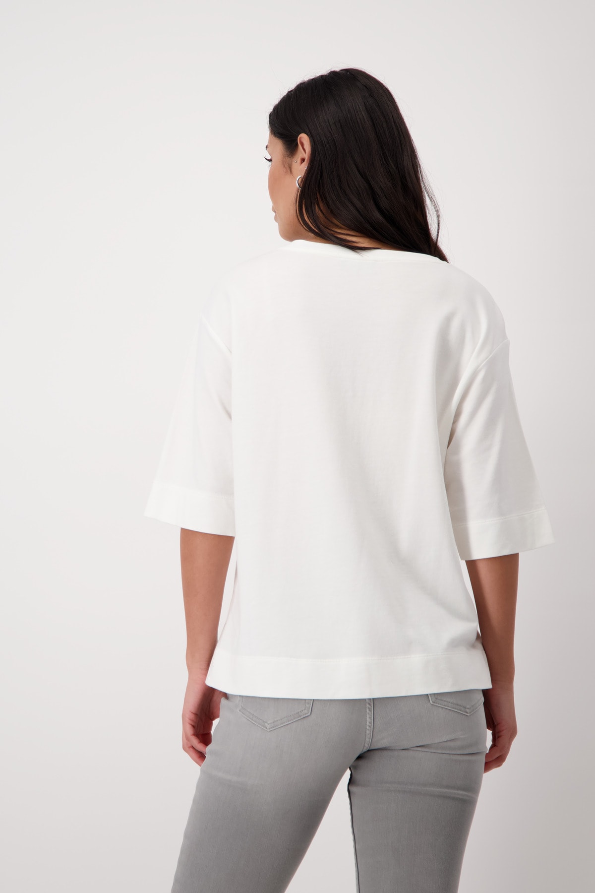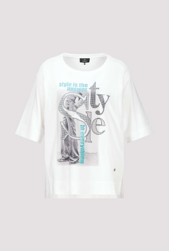 Высококачественный хлопок. Мягкое ощущение. Фотопечать с надписью блестками. Буквы из горного хрусталя. Регулярная посадка. Круглый вырез. Короткие рукава слегка внахлест. Предварительный боковой шов с разрезами. Расширенная спинка. Длина 44-го размера по спинке — 66 см, длина по переду — 62 см.