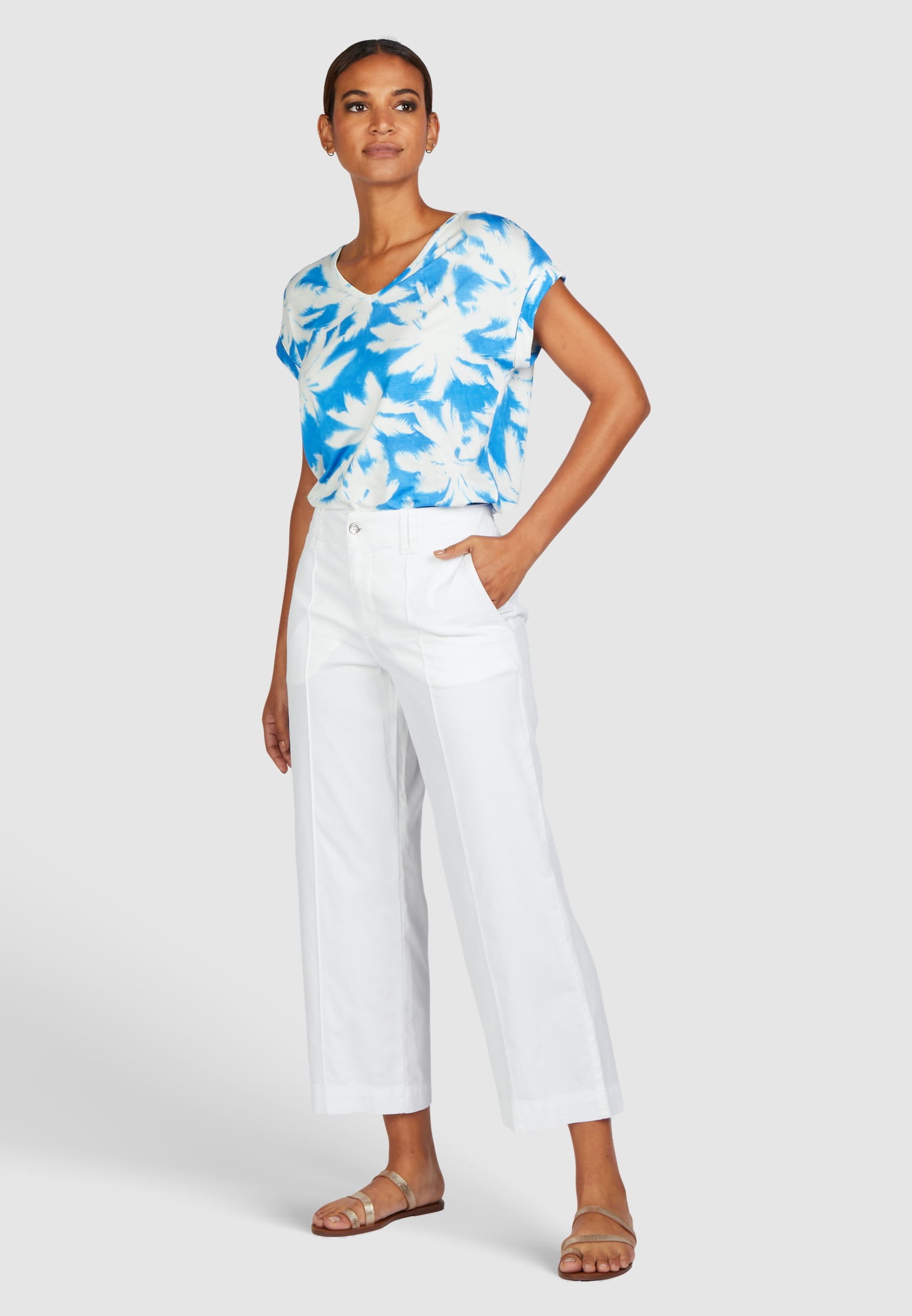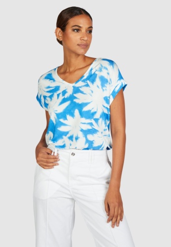 Футболка из высококачественной эластичной вискозы обеспечивает идеальную свободу движений. Принт пальмы излучает ощущение отпуска и хорошее настроение. Заниженные плечи и модная повседневная ширина дополняют изысканный, непринужденный образ.