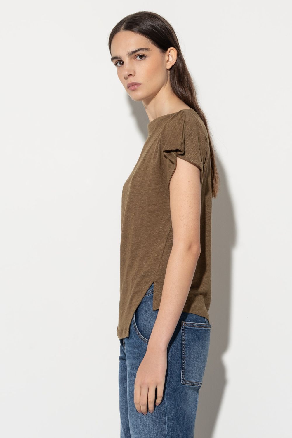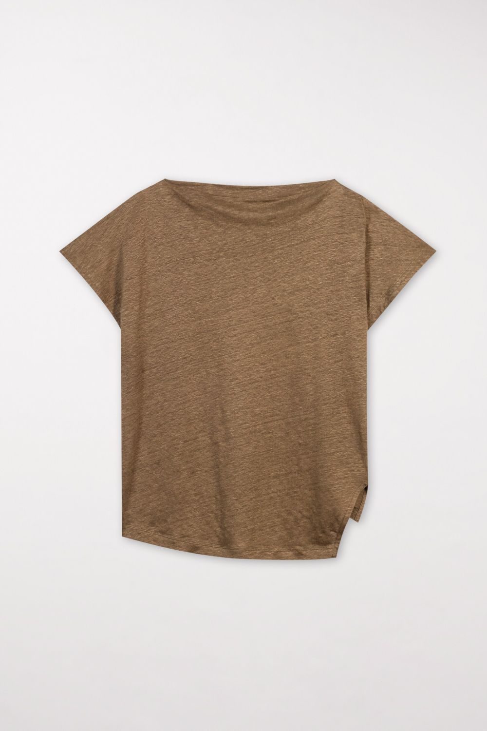 Повседневная футболка из высококачественного льняного трикотажа с укороченными рукавами и рюшами на плечах. Асимметричный подол имеет разрез сбоку.