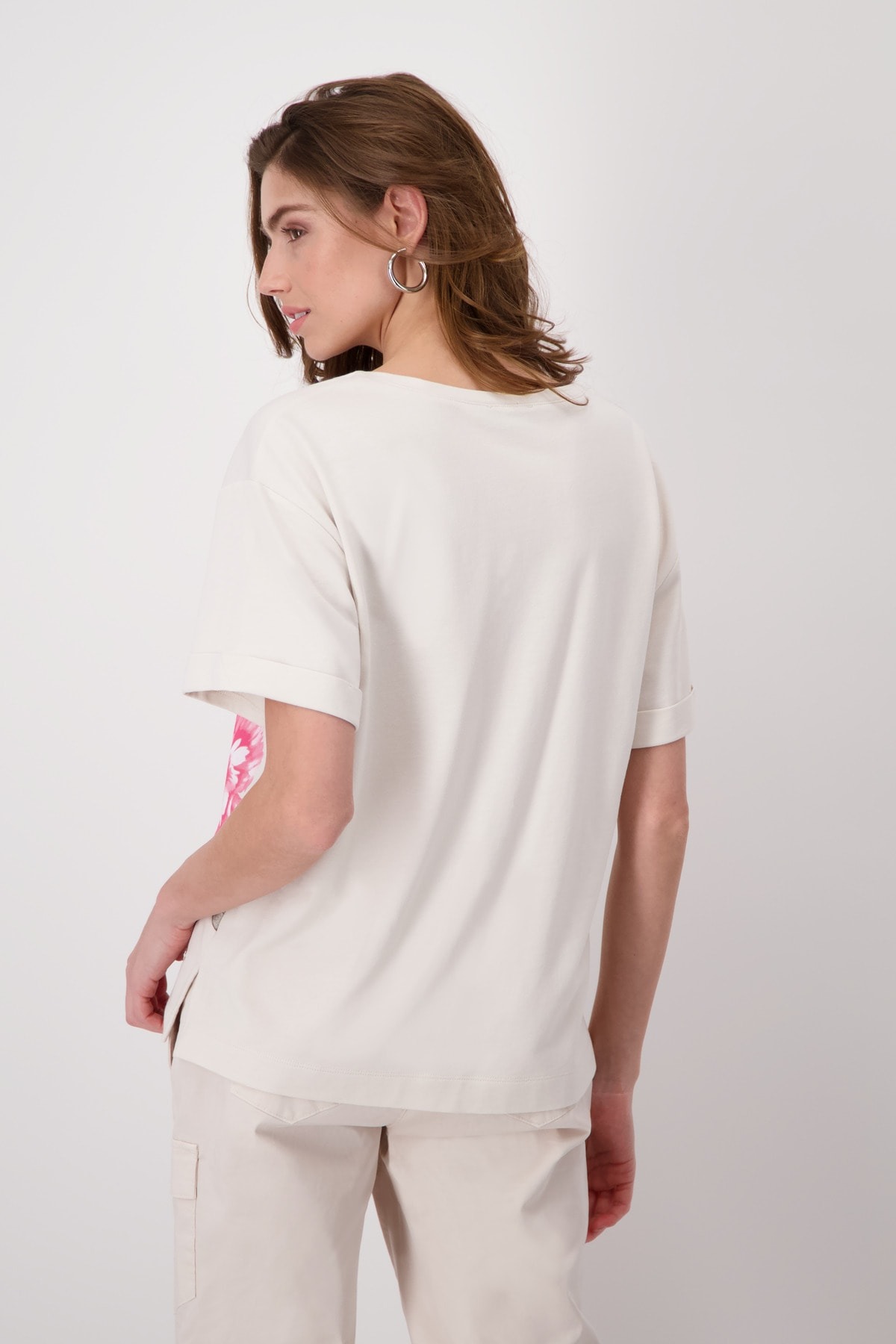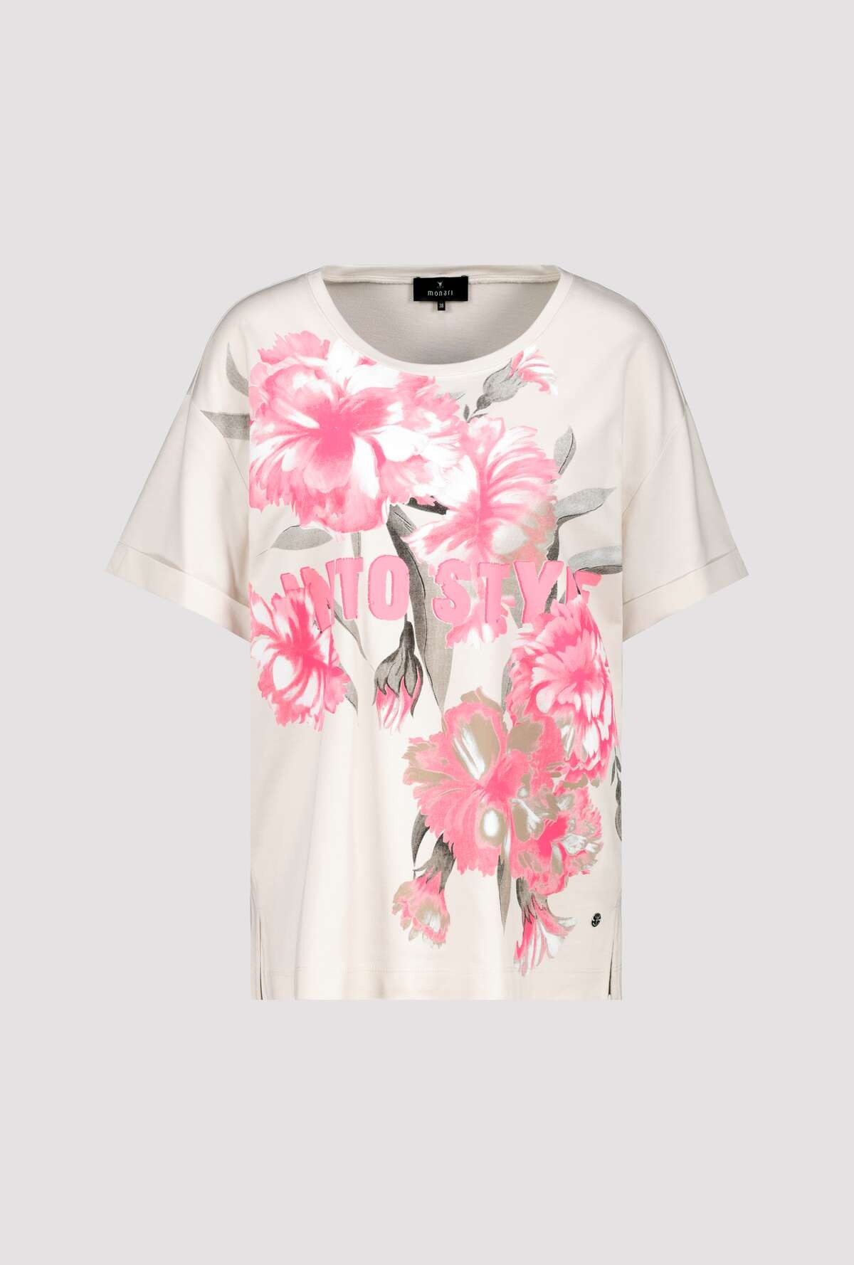 Футболка с короткими рукавами, письменным и цветочным принтом, повседневного кроя. Высококачественная смесь хлопка. Мягкое ощущение. Цветочный узор с надписью. Регулярная посадка. Круглый вырез. Манжеты. Боковые разрезы