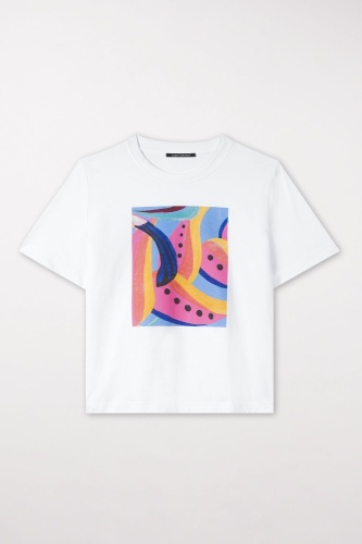 Футболка из натурального хлопка с гладкой поверхностью. Футболка классического кроя украшена ярким абстрактным принтом.