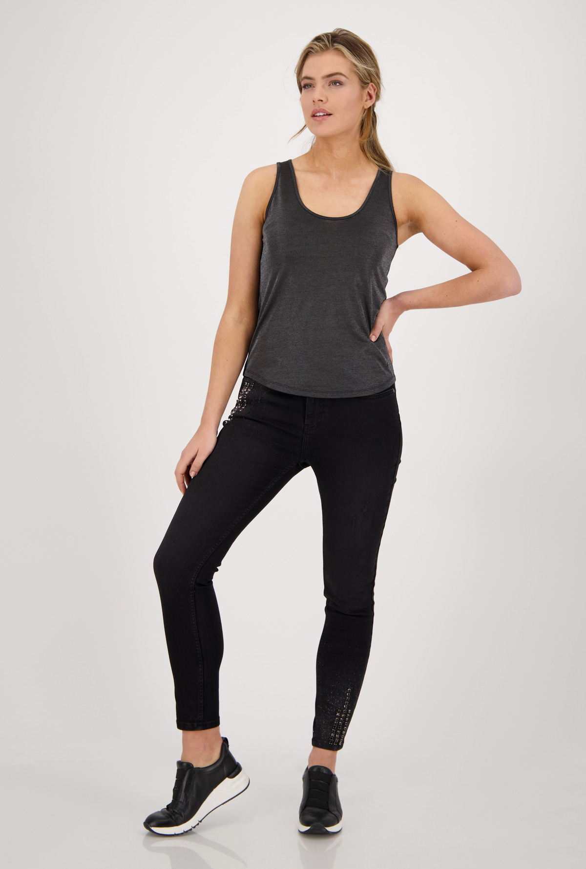 Однотонный базовый топ на широких бретелях - необходимы элемент гардероба любой современной женщины. Материал из смесовой вискозы приятен к телу.
