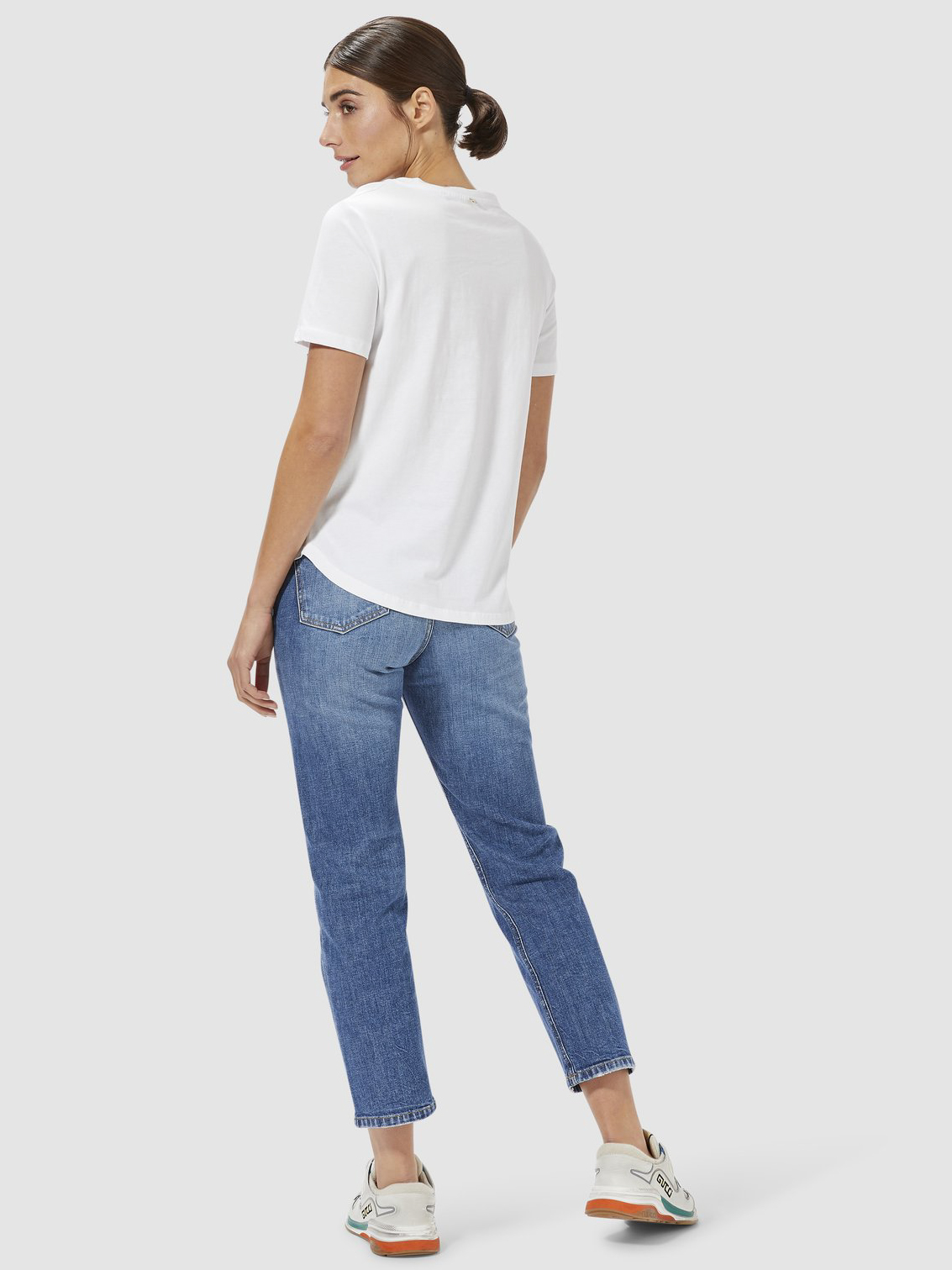 Белая хлопковая футболка с оригинальным принтом может выступать в качестве самостоятельного верха или надеваться под пиджак. Короткий втачной рукав, овальный врез горловины.