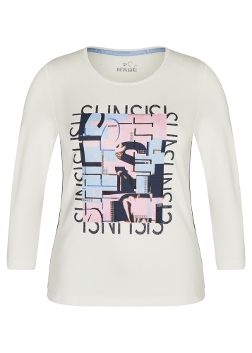 Белая футболка с абстрактным принтом на груди. Втачной рукав ¾, овальный вырез горловины.