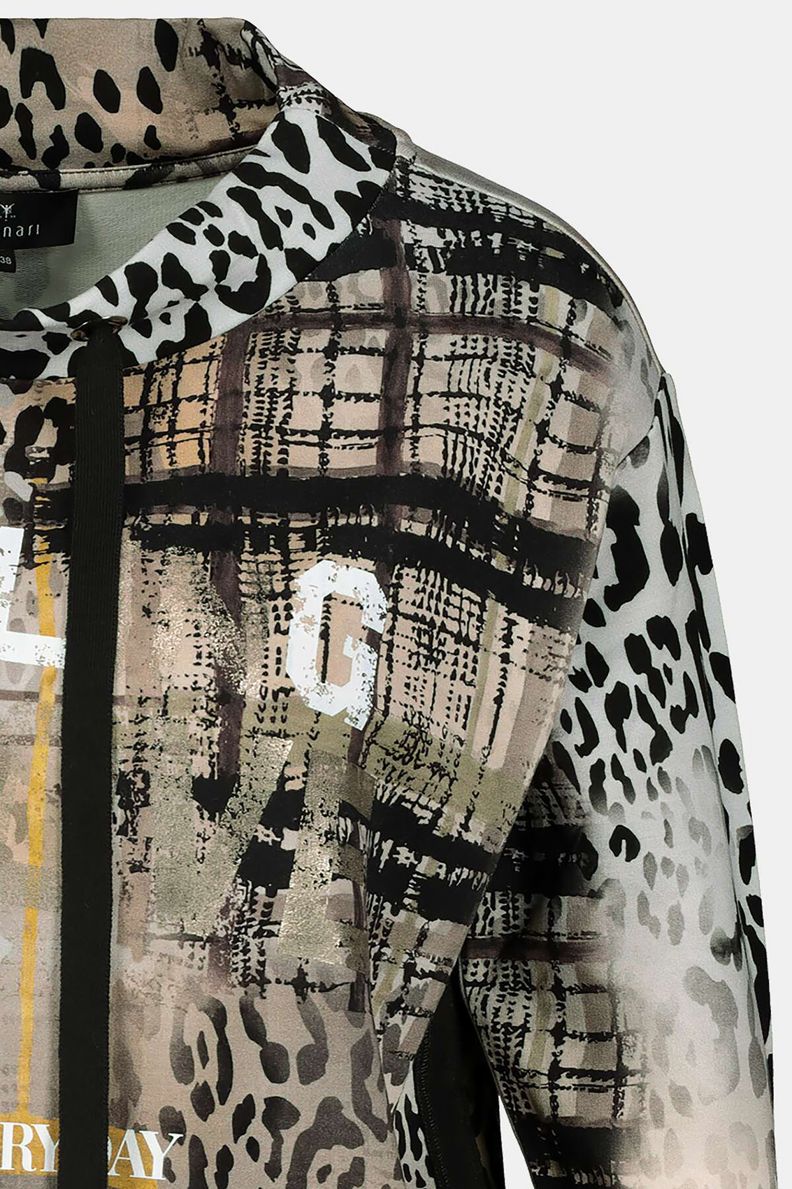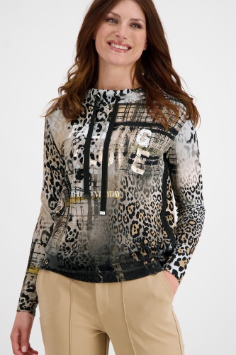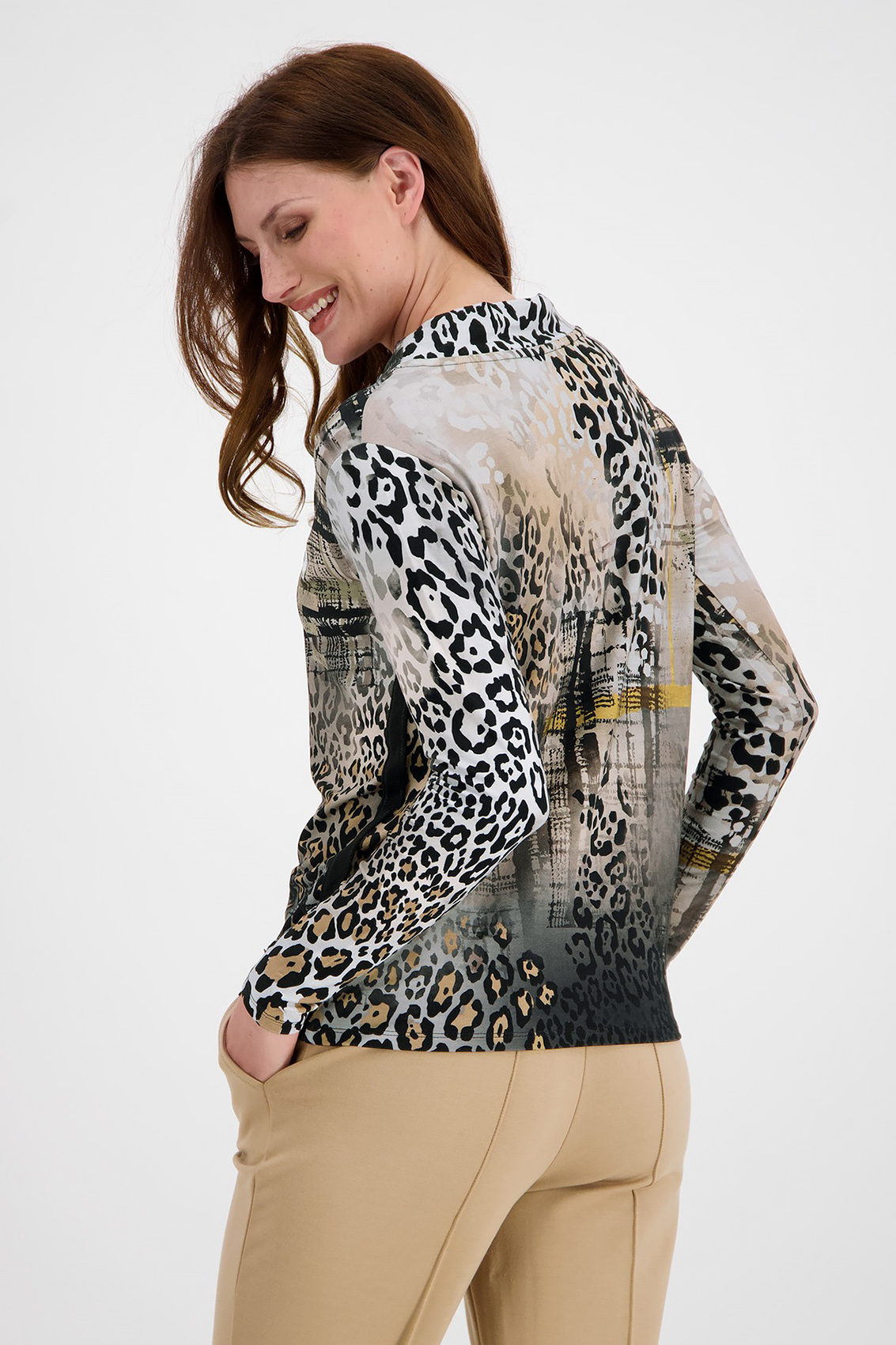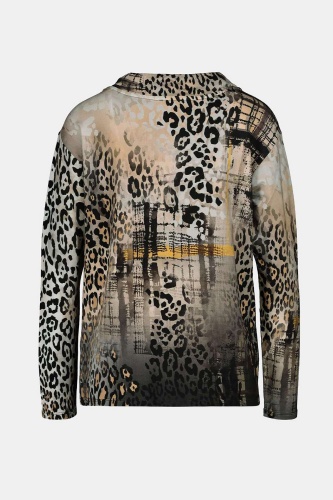 Джемпер в анималистичном принте – яркий атрибут трендового образа. Воротник-стойка на кулиске, втачной рукав полной длины. Боковой шов украшает черная лента.