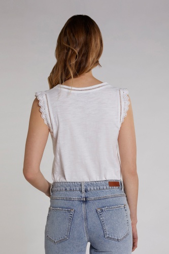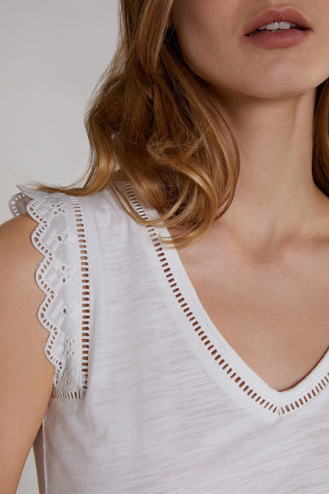 Белоснежный топ - простая, но совсем не скучная модель! Прямой покрой, V-образный вырез горловины. Обилие ажурных элементов создает романтический образ. Хлопковый материал приятен к телу и обеспечивает комфорт. Этот топ - прекрасный вариант верха в любом модном ансамбле.