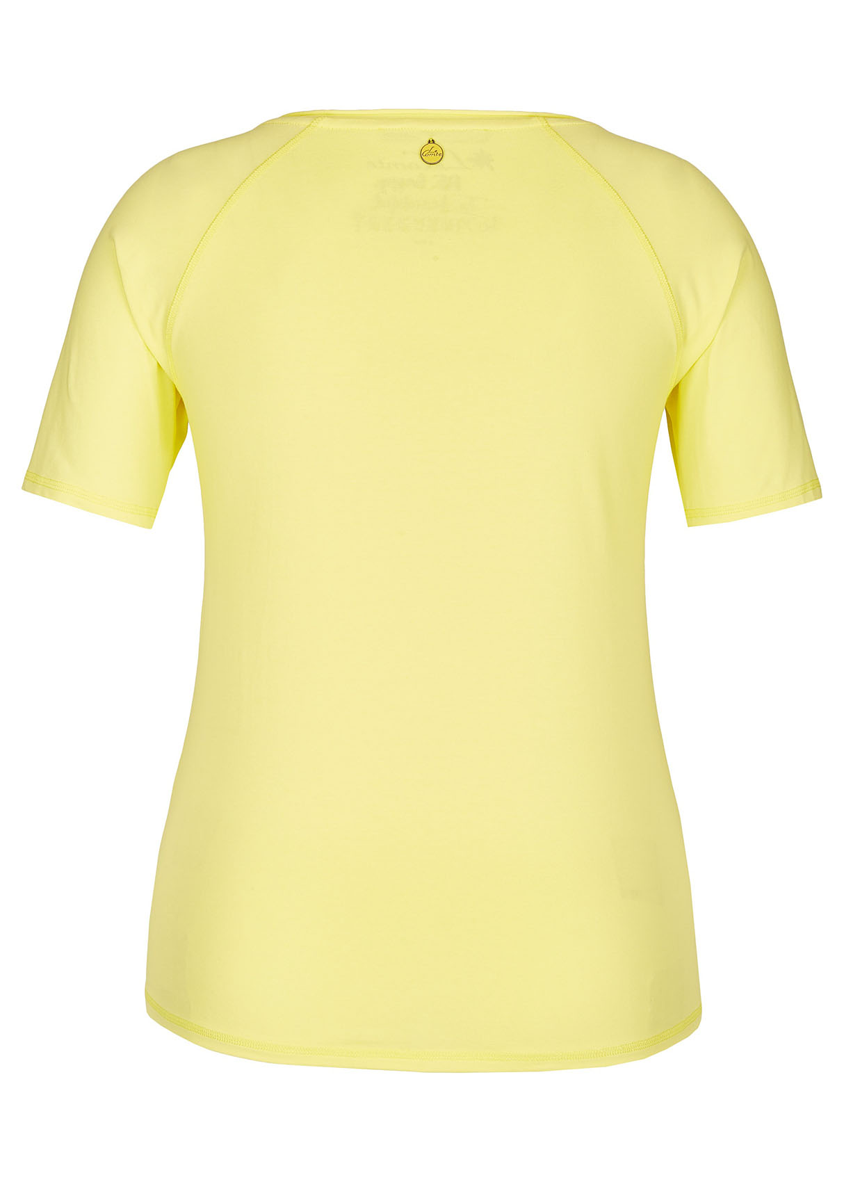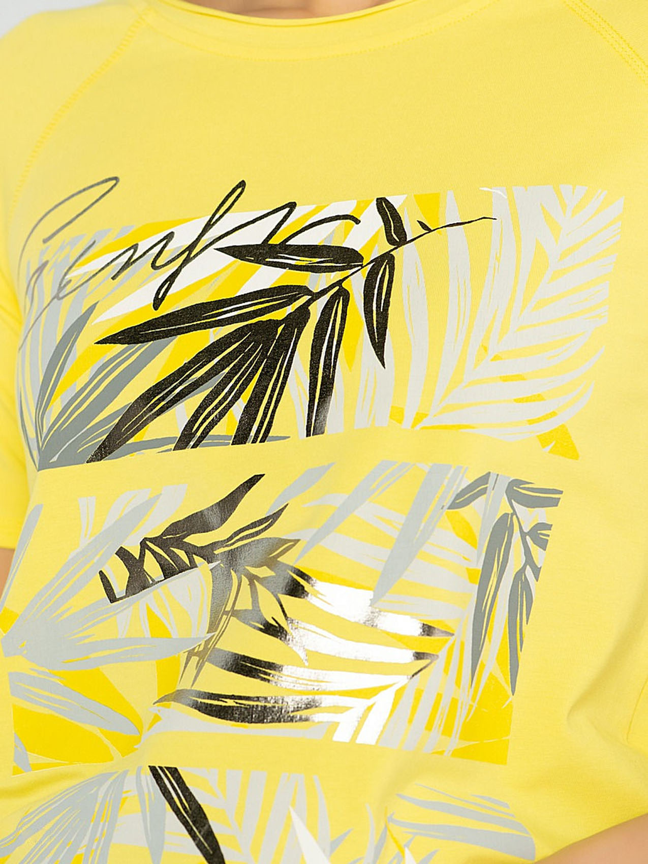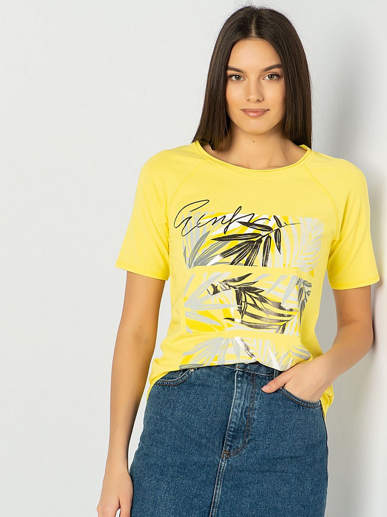 Яркая футболка - залог солнечного настроения! Трендовый принт с тропическими мотивами подчеркнет вкус обладательницы футболки. Вырез "лодочка", рукава реглан. Приятный к телу материал из смеси хлопка и эластана.