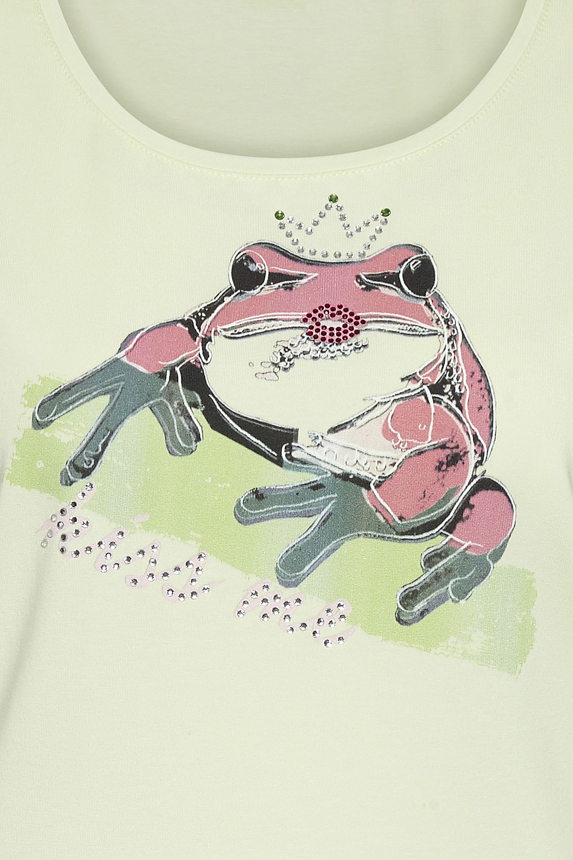 Футболка полуприлегающего силуэта обратит на себя внимание благодаря забавному принту с лягушкой. Материал из хлопка и эластана обеспечит комфорт и отличную посадку на фигуре. Эта модель хорошо будет смотреться как с брюками, так и с юбкой.