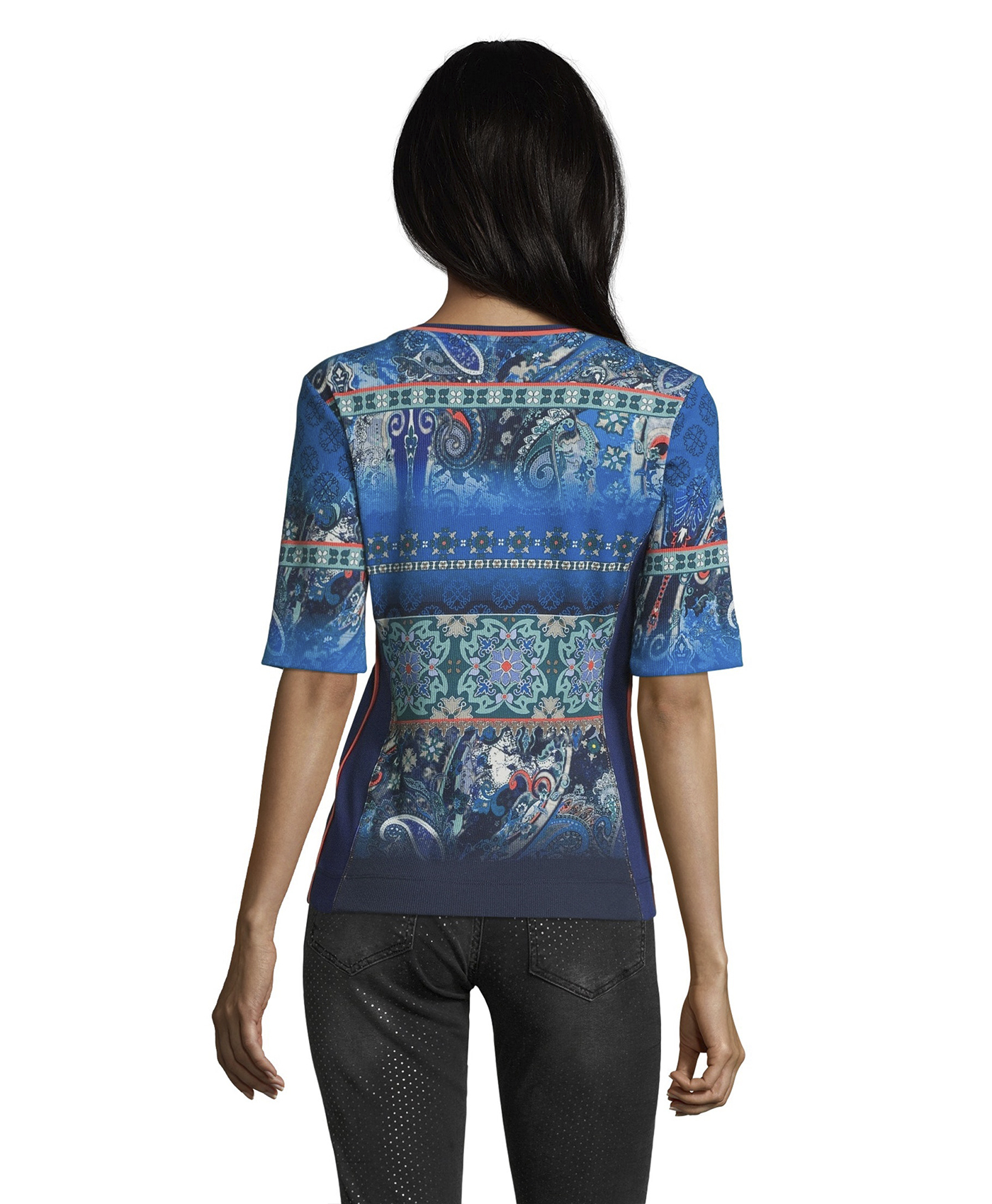Футболка приталенного силуэта подчеркивает достоинства фигуры. Круглый вырез горловины, рукава 1/2. Материал из хлопковой смеси обеспечивает комфорт. Этнический принт и красивое сочетание контрастных цветов непременно обратят на себя внимание. Эта яркая вещь освежит любой комплект одежды!