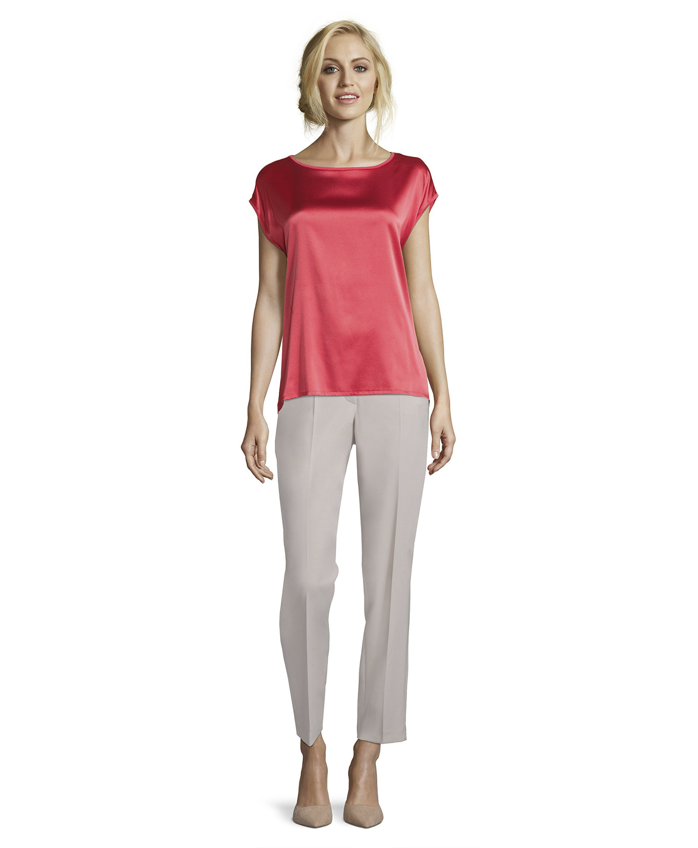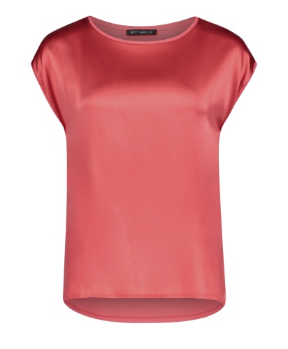 Однотонная футболка - обязательная модель любого гардероба! Прямой покрой, вырез горловины "лодочка", короткие цельнокроеные рукава. Благородный материал из смеси шелка приятен к телу. Атласный блеск передней части изделия контрастирует с матовым материалом спинки. Эта универсальная футболка смотрится очень элегантно и станет изюминкой вашего делового образа.