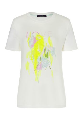 Яркий принт этой футболки непременно привлечет внимание! Футболка приталенного силуэта. Круглый вырез горловины, короткие втачные рукава. Приятный к телу материал из хлопковой смеси.