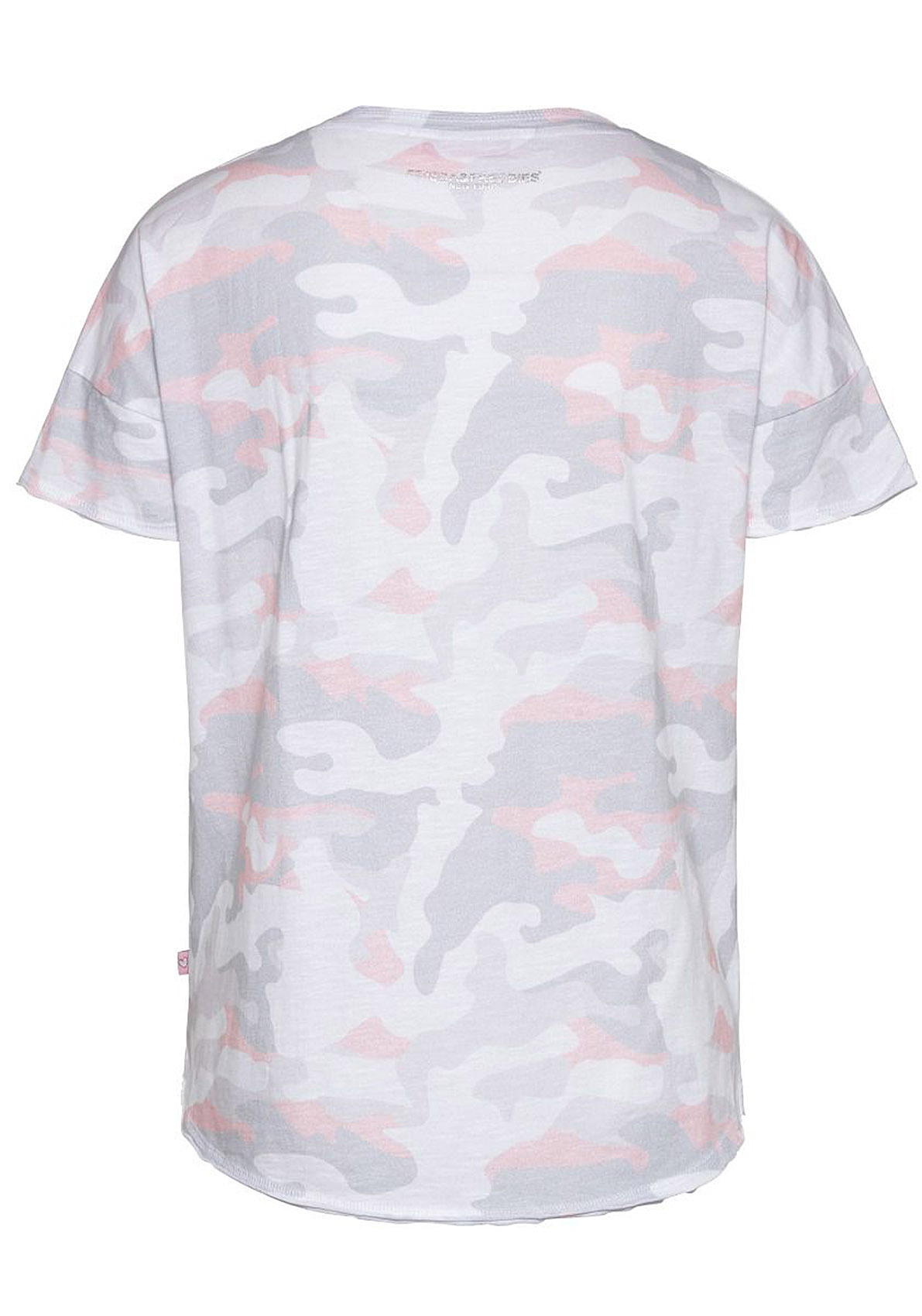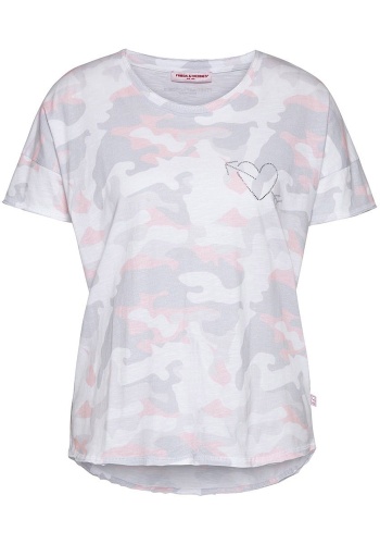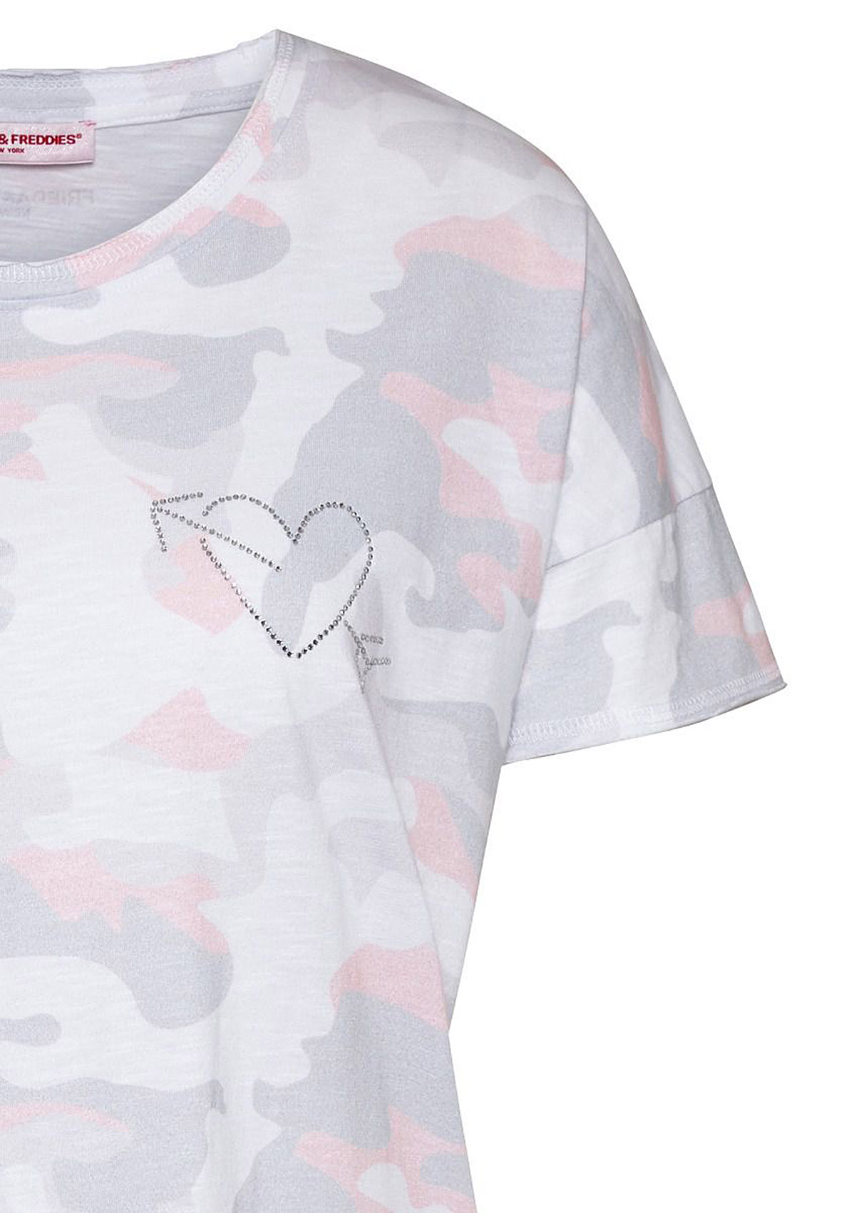 Стильный камуфляж на каждый день! Легкая структура хлопковой ткани, свободный покрой, спущенное плечо и открытые срезы изделия создают очень непринужденный вид. Небольшой акцент - декор из страз в виде сердца.