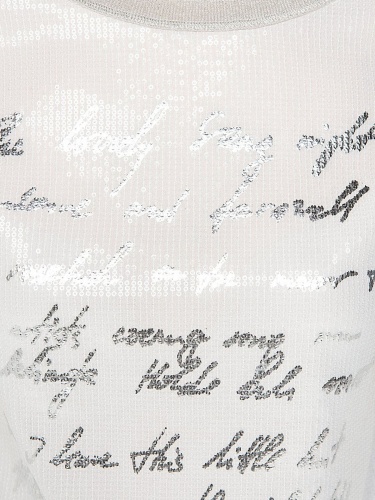 Элегантная футболка из ткани с пайетками. Слегка приталенный силуэт. Короткие цельнокроеные рукава. Приятный к телу материал из смеси вискозы и эластана.
