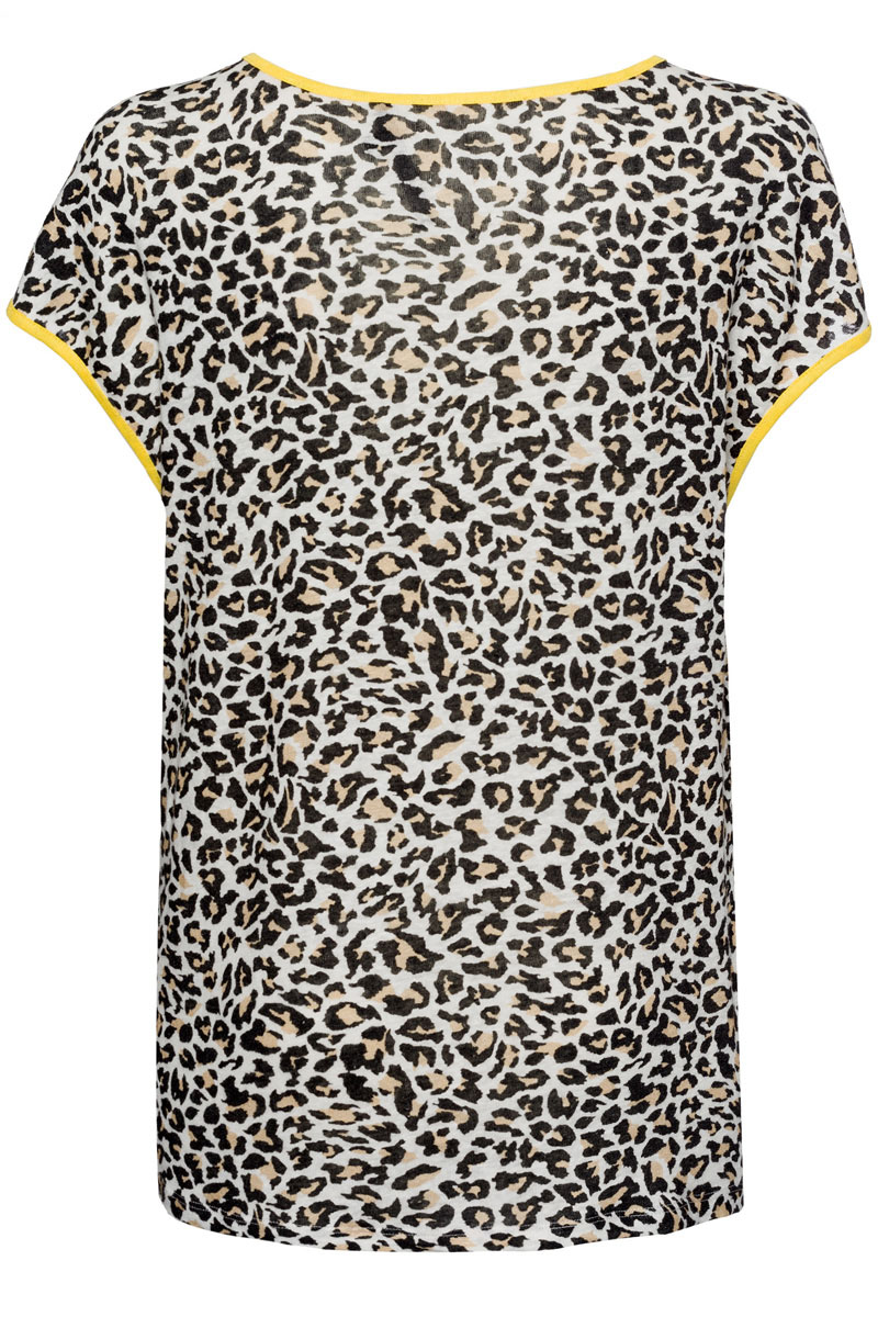 Футболка в трендовом принте. Свободный крой, V-образный вырез горловины, короткие цельнокроеные рукава. Контрастная отделка на горловине и рукавах. Льняной материал приятен к телу и обеспечивает комфорт.