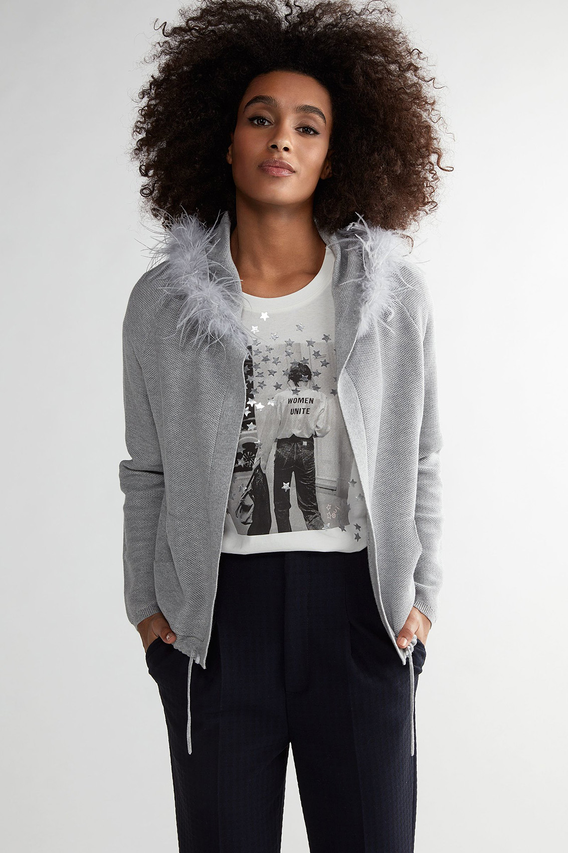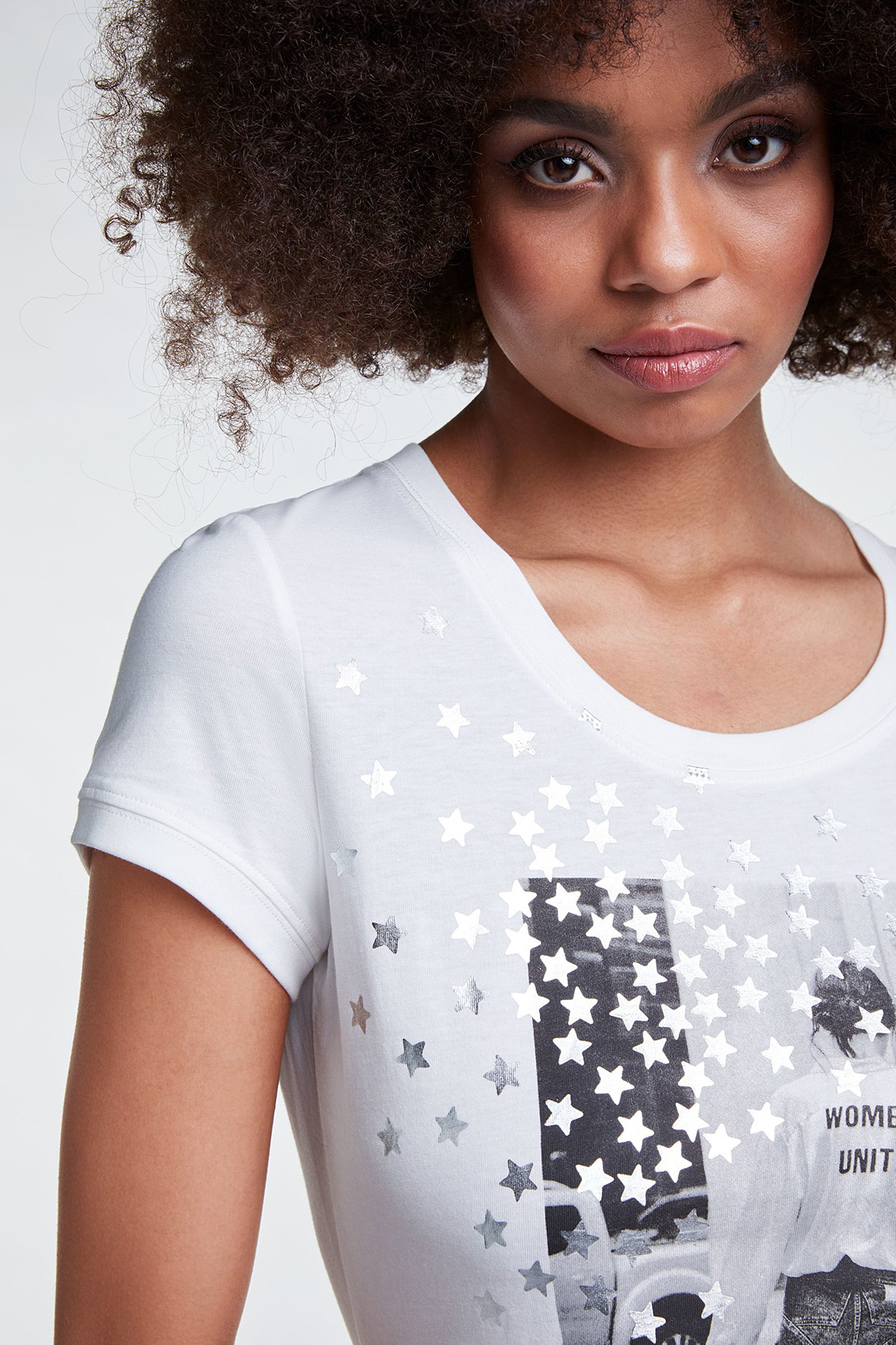 Стильная футболка полуприталенного силуэта. Круглый вырез горловины, короткие втачные рукава, принт с металлизированными элементами в виде звезд. Приятный к телу хлопковый материал обеспечивает комфорт.