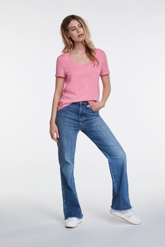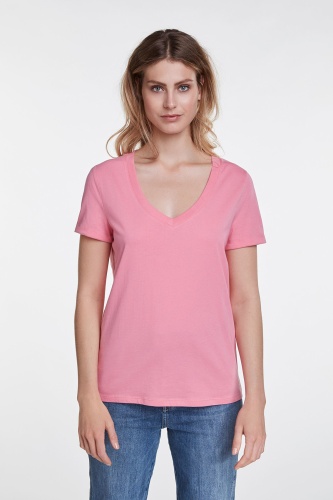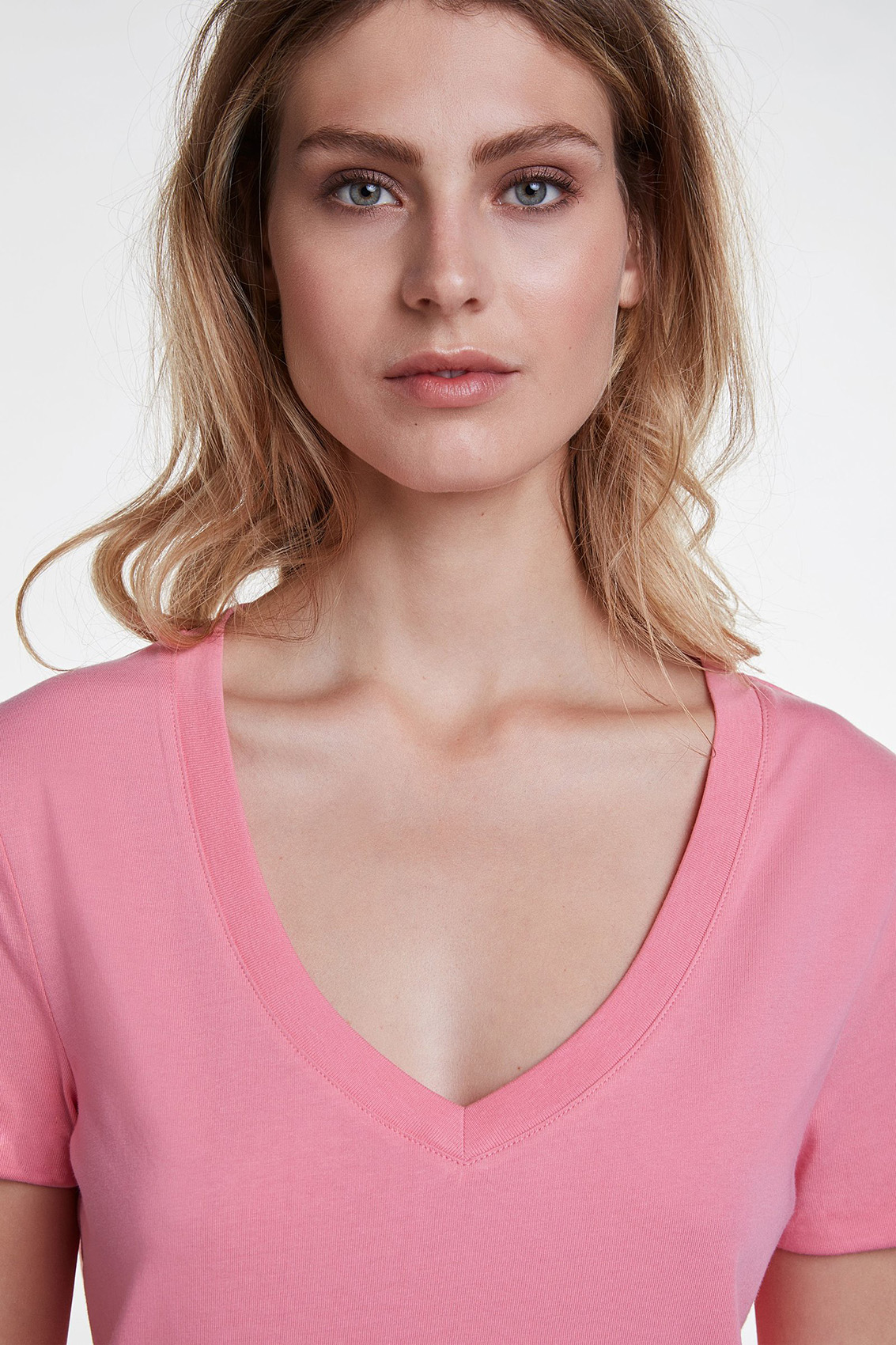 Базовая однотонная футболка сочетается с любыми вещами и является необходимым элементом современного гардероба. Прямой покрой, V-образный вырез горловины, короткие втачные рукава. Приятный к телу хлопковый материал обеспечивает комфорт в ношении.