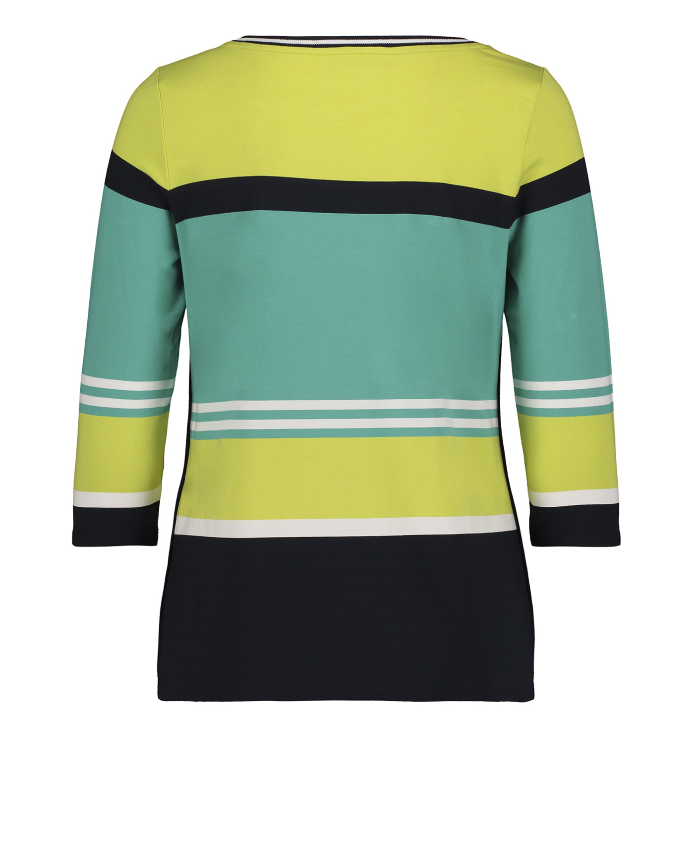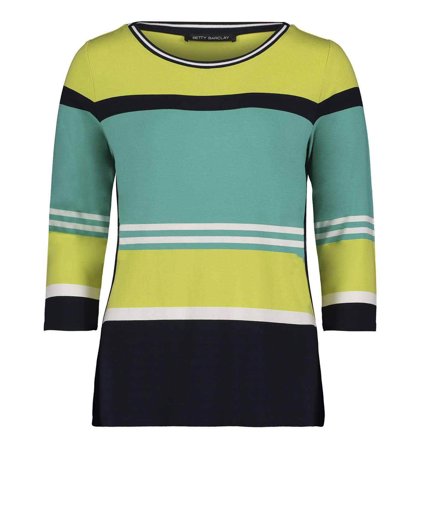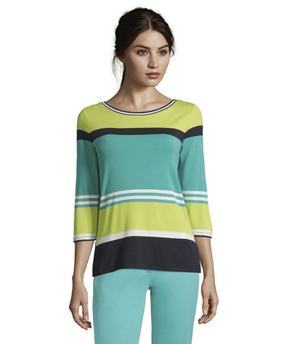 Футболка-лонгслив в полоску. Прямой покрой, вырез горловины "лодочка", рукава 3/4. Материал из вискозной смеси приятен к телу и обеспечивает комфорт. Эта футболка великолепно смотрится с любым однотонным вариантом низа, будь то брюки или юбка.