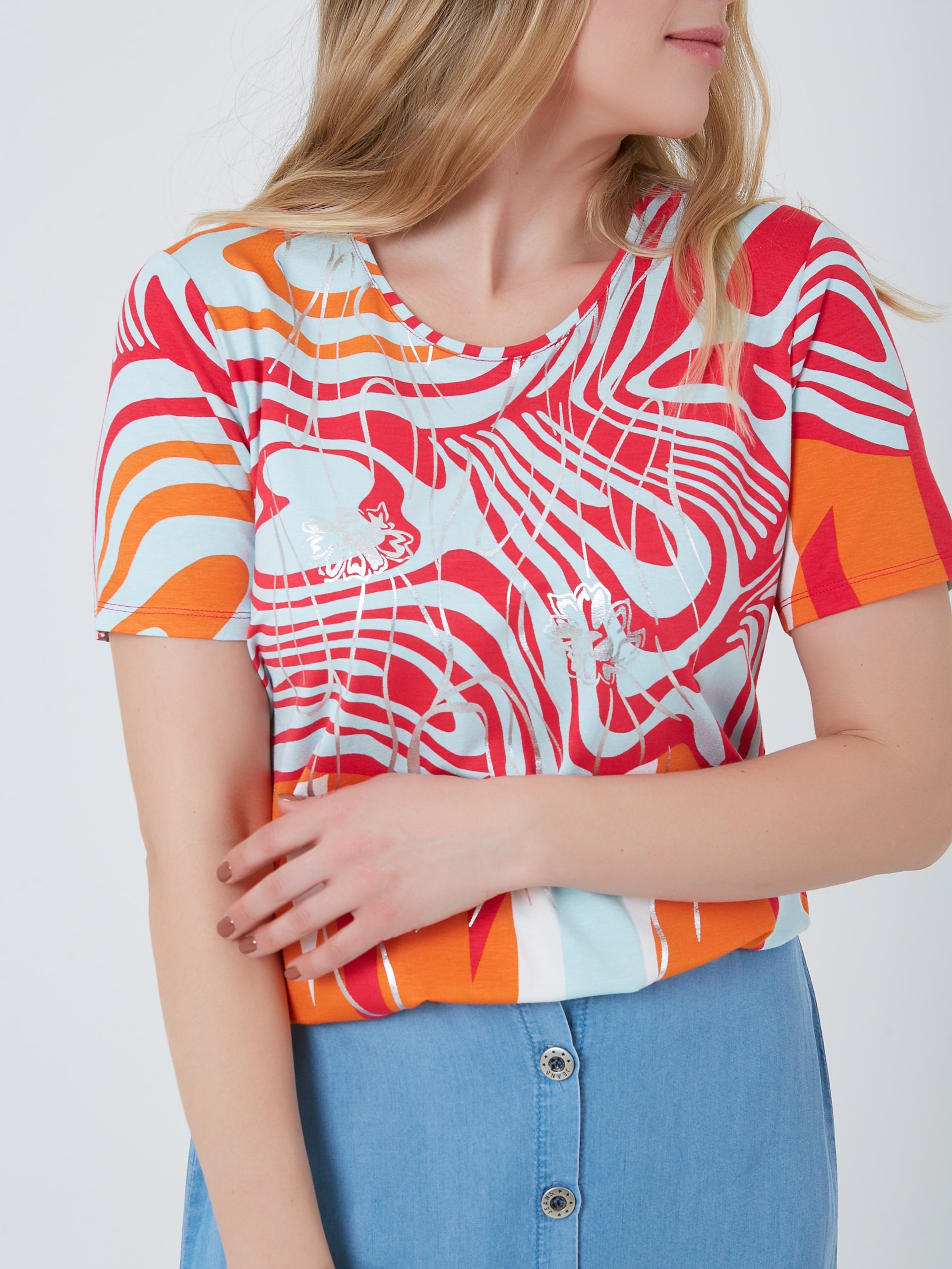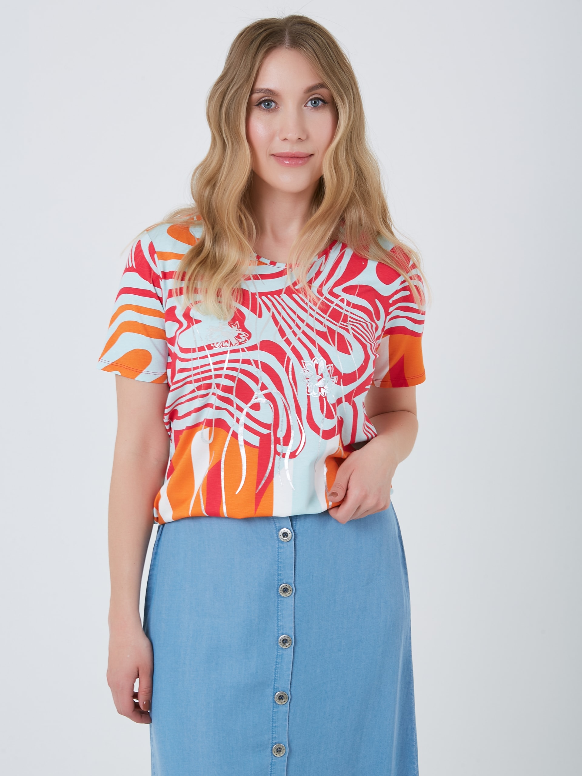 Футболка с ярким абстрактным узором в красных и оранжевых тонах, прекрасно дополнит летний образ и добавит яркости в гардероб. Весна-Лето 2025. Капсула "Санторини". Параметры модели: 89-70-92, рост 167, размер 44-46