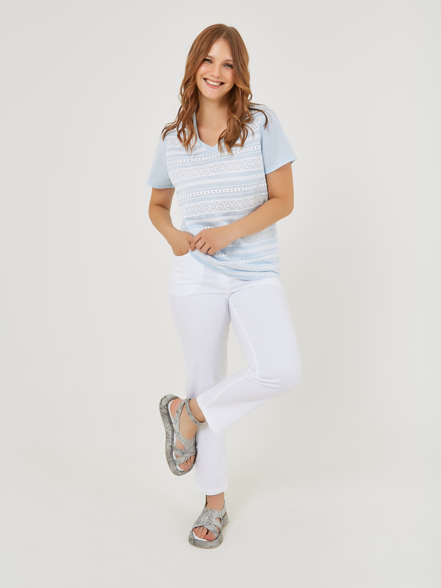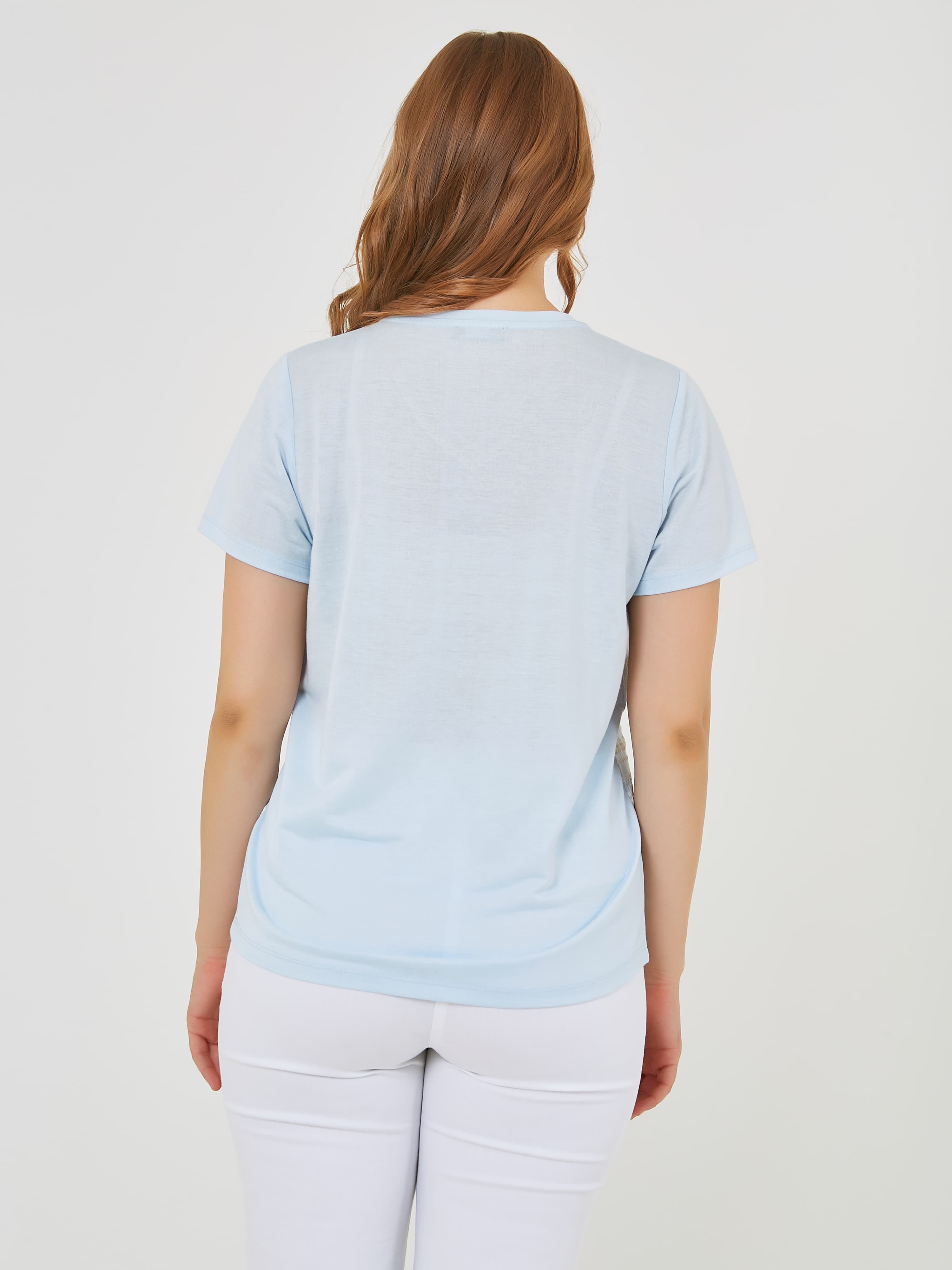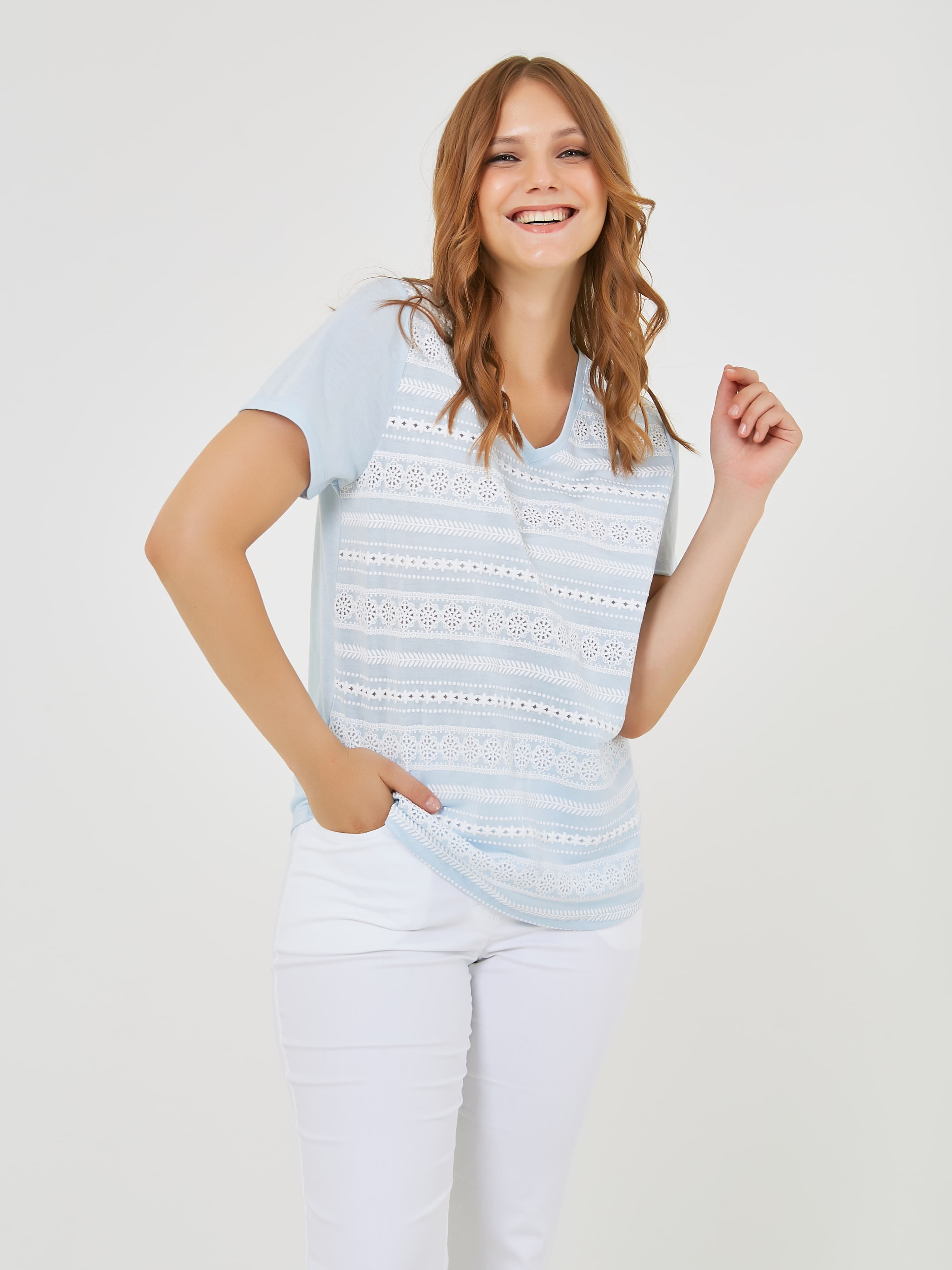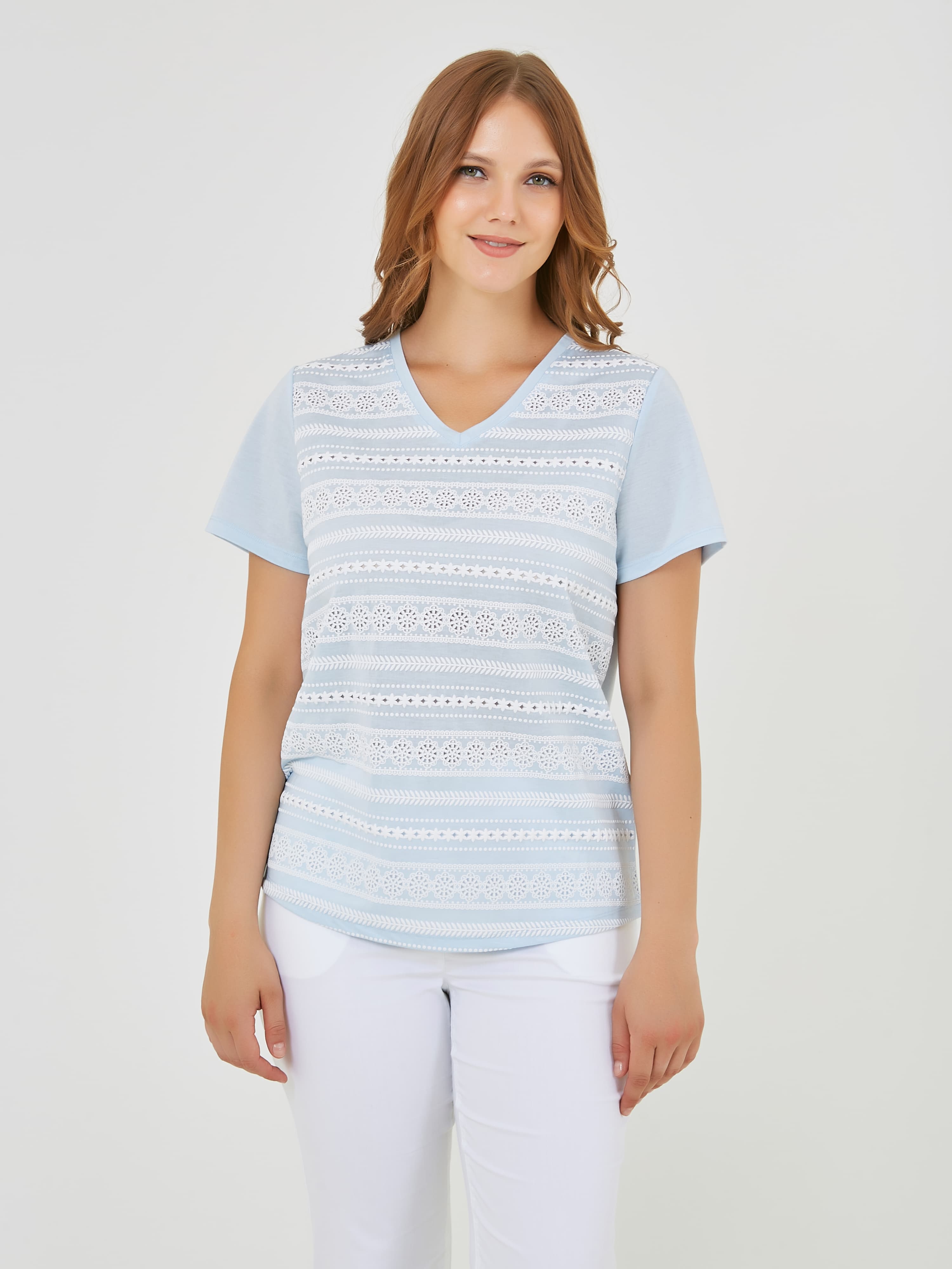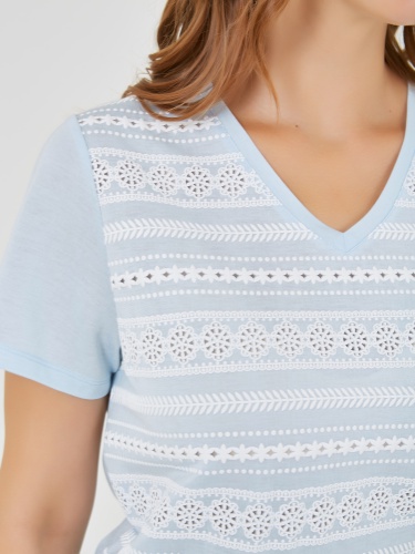 Футболка выполнена в нежных пастельных оттенках голубого которые добавляют свежести и легкости образу. Уникальные детали, такие как вставки с кружевным узором и V-образный вырез, создают стильный акцент. Коллекция Весна-Лето 2025. Капсула "Санторини". Параметры модели: 95-64-101, рост 175, размер 44-46