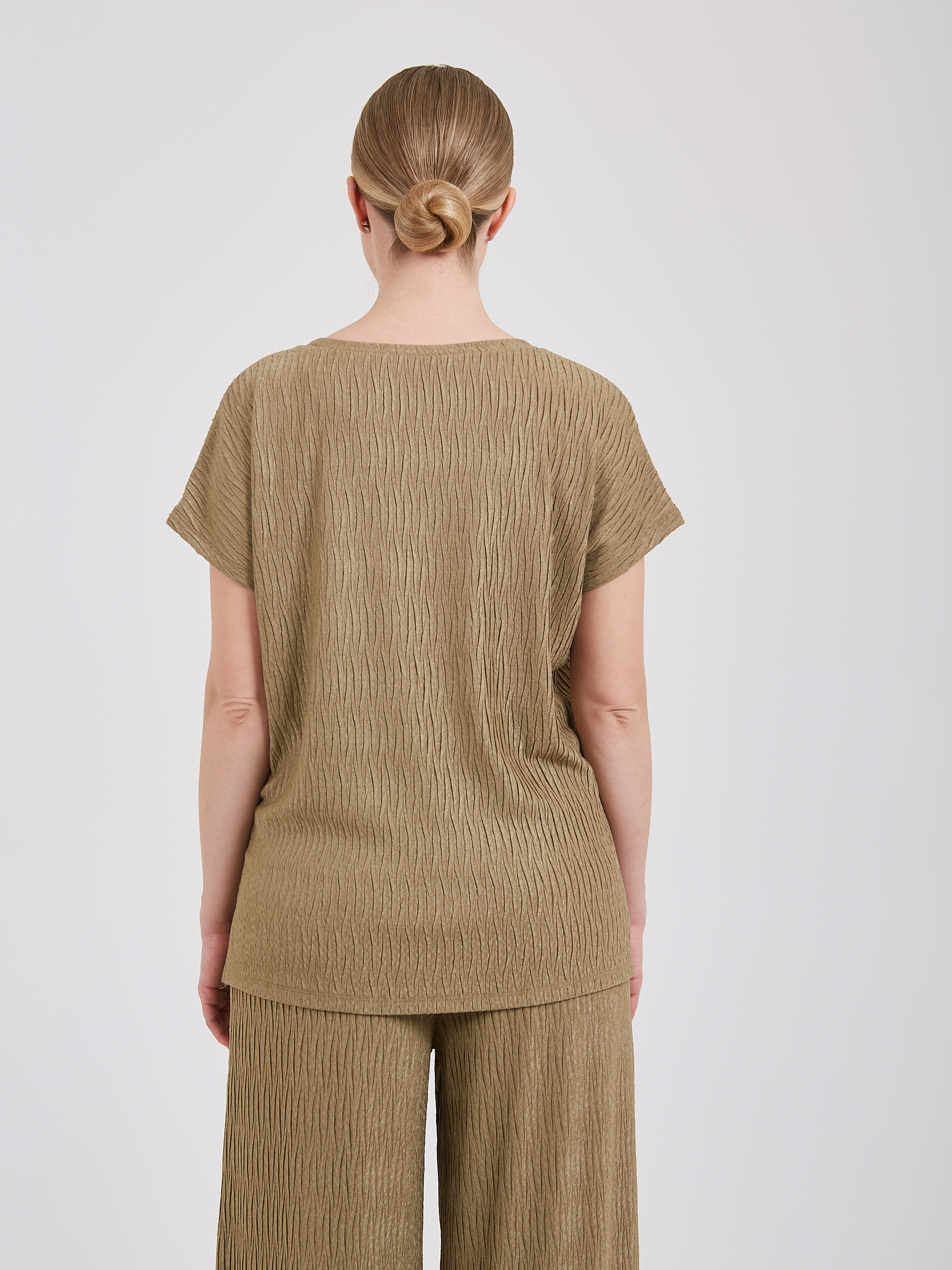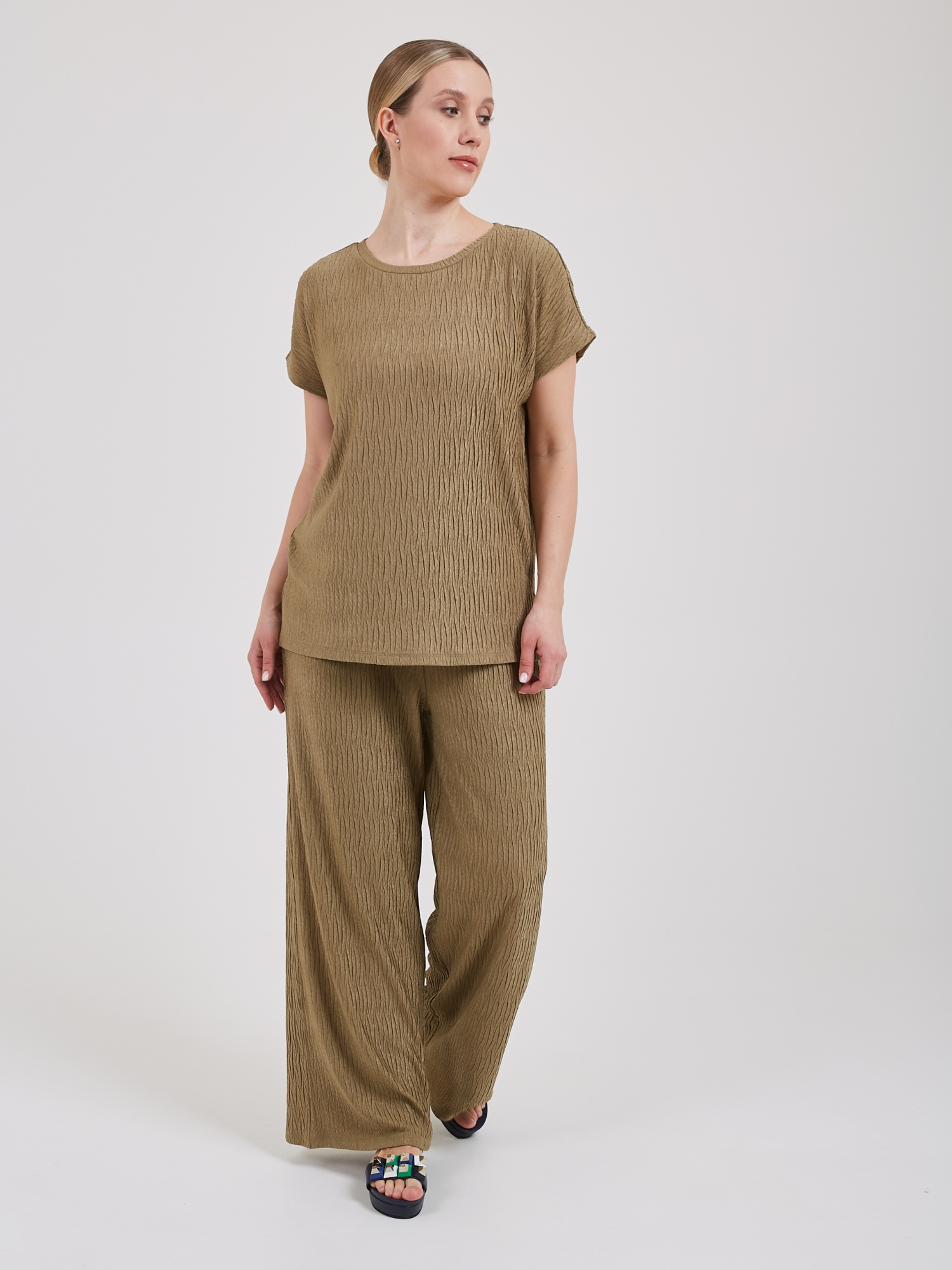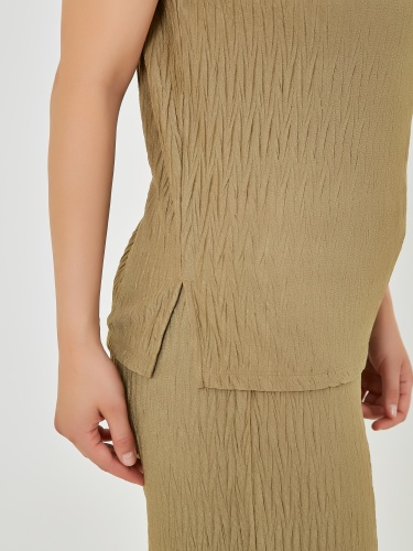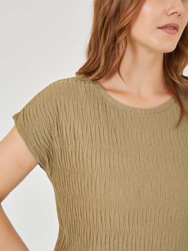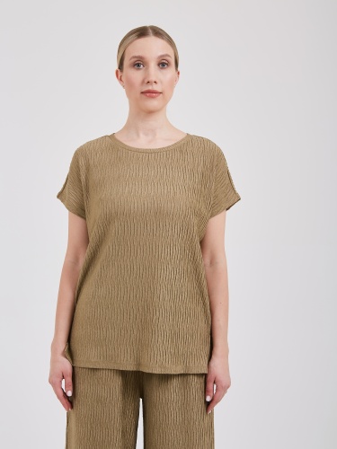 Стильная футболка с уникальной текстурой с рельефом добавляет оригинальности, а свободный крой обеспечивает свободу движений. Коллекция Весна-Лето 2025. Капсула "Рио де Жанейро". Параметры модели: 89-70-92, рост 167, размер 44-46