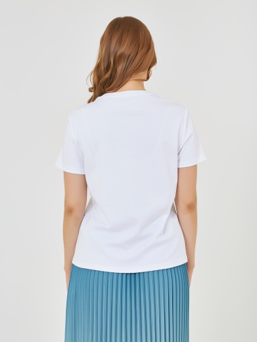 Футболка белого цвета с ярким цветочным принтом, изображающим букет различных цветов, выполнена из мягкого и комфортного материала. Она отлично подойдет для создания лёгкого и стильного повседневного образа. Коллекция Весна-Лето 2025. Капсула "Санторини". Параметры модели: 95-64-101, рост 175, размер 44-46