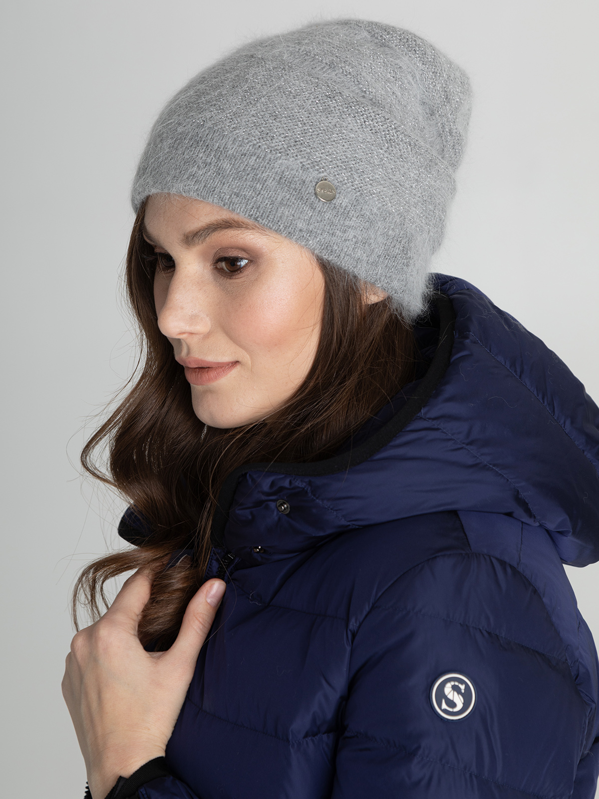 Однотонная шапочка-бини из ангоры с добавлением смесовой шерсти. Нить люрекса обеспечивает приятный блеск. Шапка хорошо сохраняет тепло и подходит для любого овала лица.
