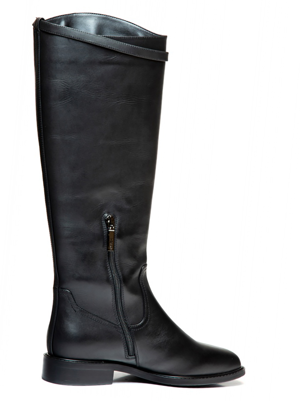 Женские кожаные сапоги жокейского стиля на подкладке из байки. Декорированы кожаным ремешком с пряжкой. Молния 3/4 с внутренней стороны.