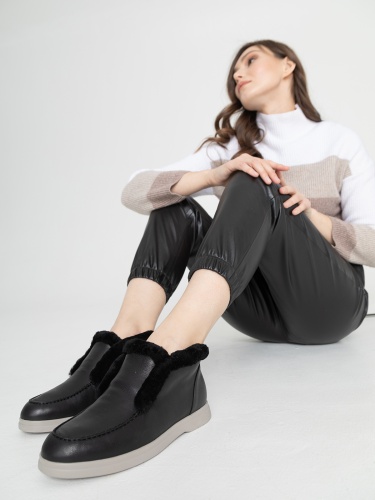 Короткие зимние ботинки из велюра черного оттенка на плоской контрастной подошве. Оторочка из натурального меха в тон. Ботинки отлично дополнят повседневный образ из теплого спортивного костюма, также выигрышно будут смотреться с джинсами или джоггерами.