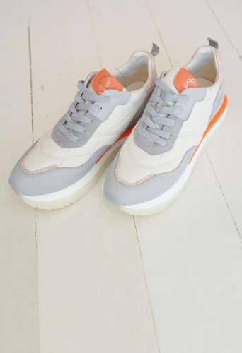 Серые кроссовки TUFFONI из натуральной кожи с яркими оранжевыми акцентами.